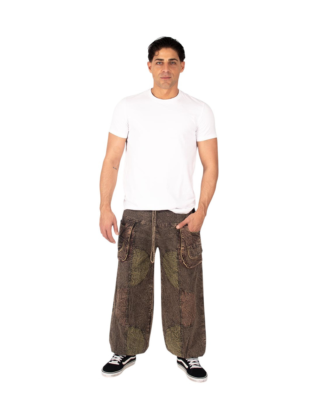 Unisex-Haremshosen aus Baumwolle mit Used-Look, handgefertigtem Design und in verschiedenen Farben.