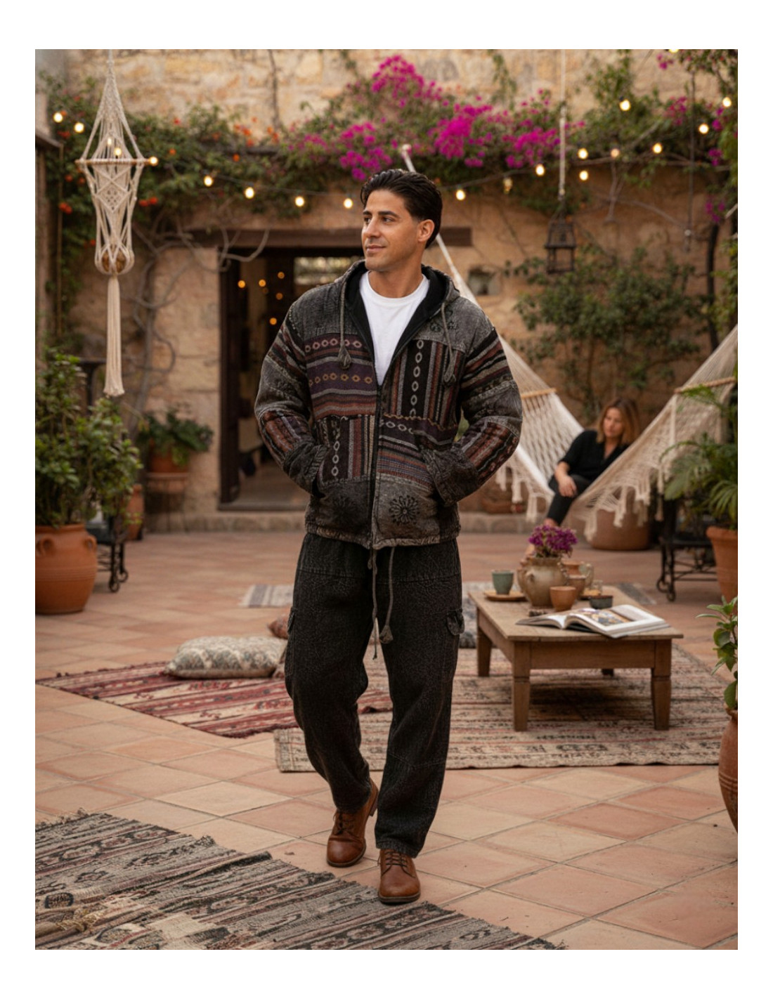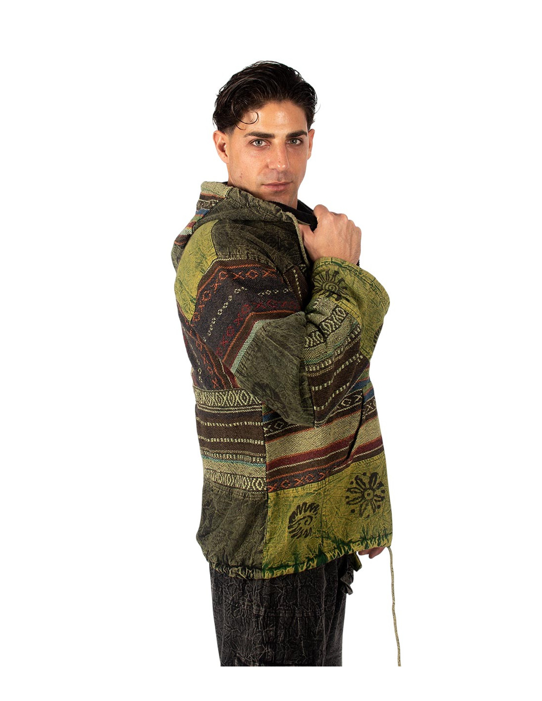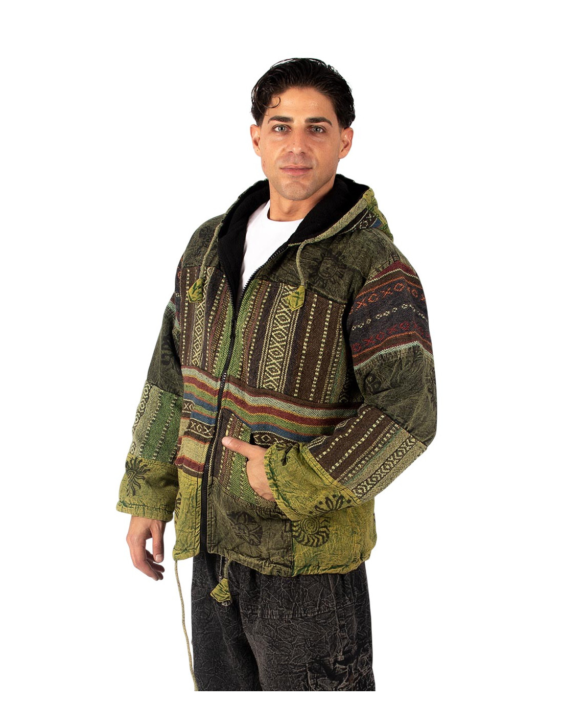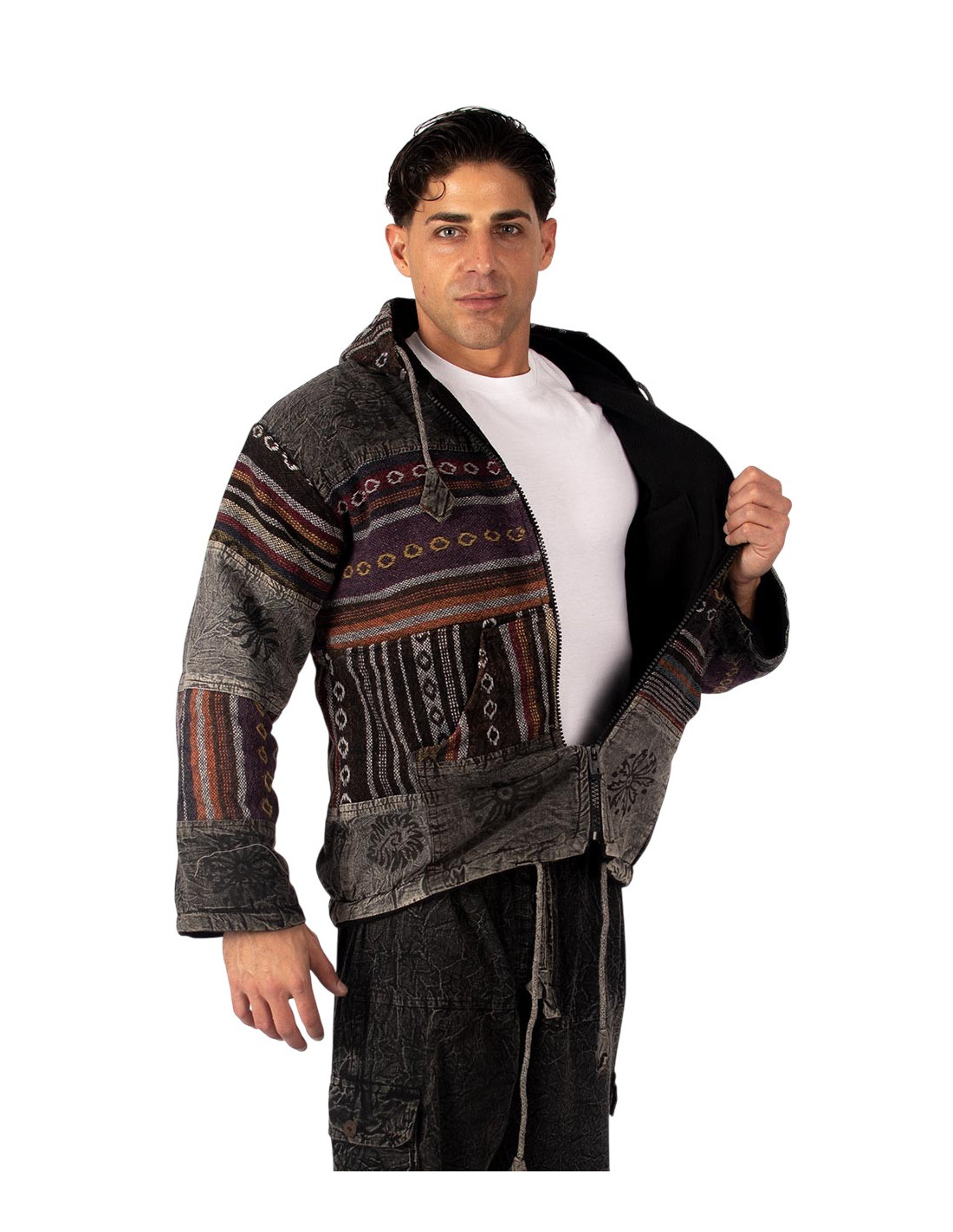 Es verfügt über einen mittigen Reißverschluss, eine verstellbare Kapuze und zwei funktionelle Vordertaschen , die dem Design Praktikabilität und einen Hauch von Bohème verleihen.