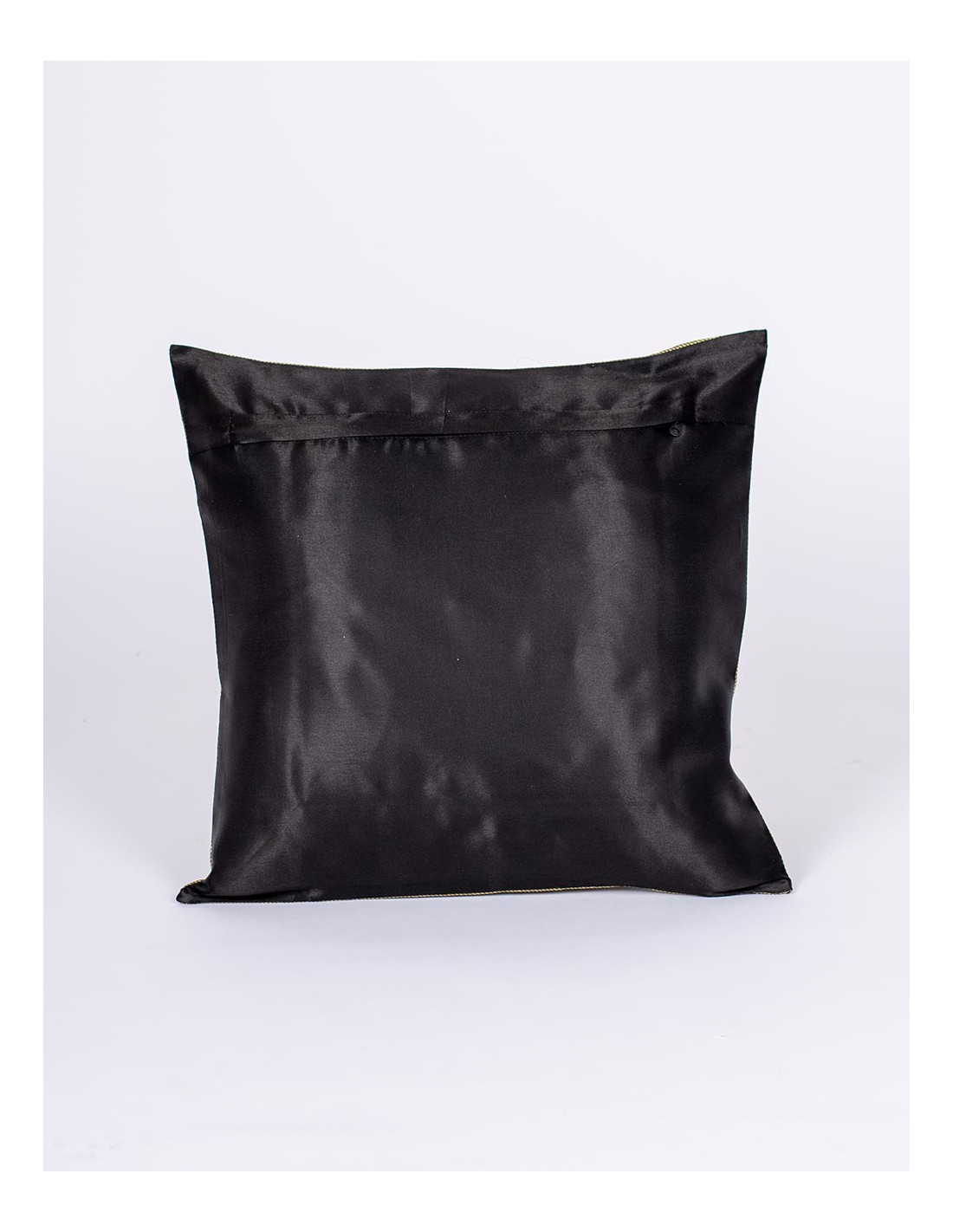 Die Vorderseite ziert ein Vogelmotiv , ein in der indischen Volkskunst und im kulturellen Dekor weit verbreitetes Dekorationselement, das eine spirituelle und natürliche Ausstrahlung verleiht. Die schlichte schwarze Rückseite sorgt für eine ausgewogene und vielseitige Ästhetik und eignet sich ideal zum Kombinieren mit anderen Textilien oder Kissen.