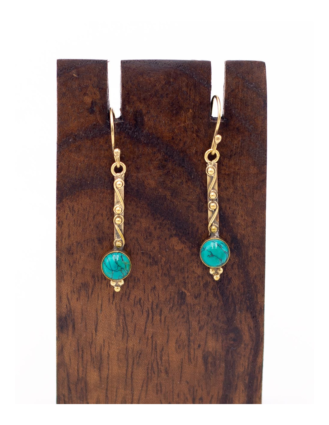 Sie sind aus vergoldetem Messing gefertigt und sorgfältig von Hand geschnitzt . Sie zeichnen sich durch ein längliches Design mit Details aus, die an indische Handwerkstraditionen erinnern. Am Ende jedes Ohrrings ist ein anderer natürlicher Mineralstein eingelassen, der jedem Paar Authentizität und eine besondere Energie verleiht.