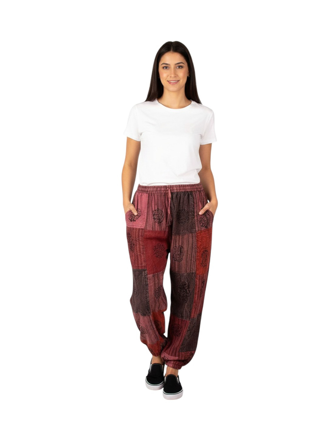Unisex-Haremshose aus handgefertigtem Patchwork- Baumwollstoff mit elastischem Bund und Beinabschlüssen , Seitentaschen und Zierschleife.