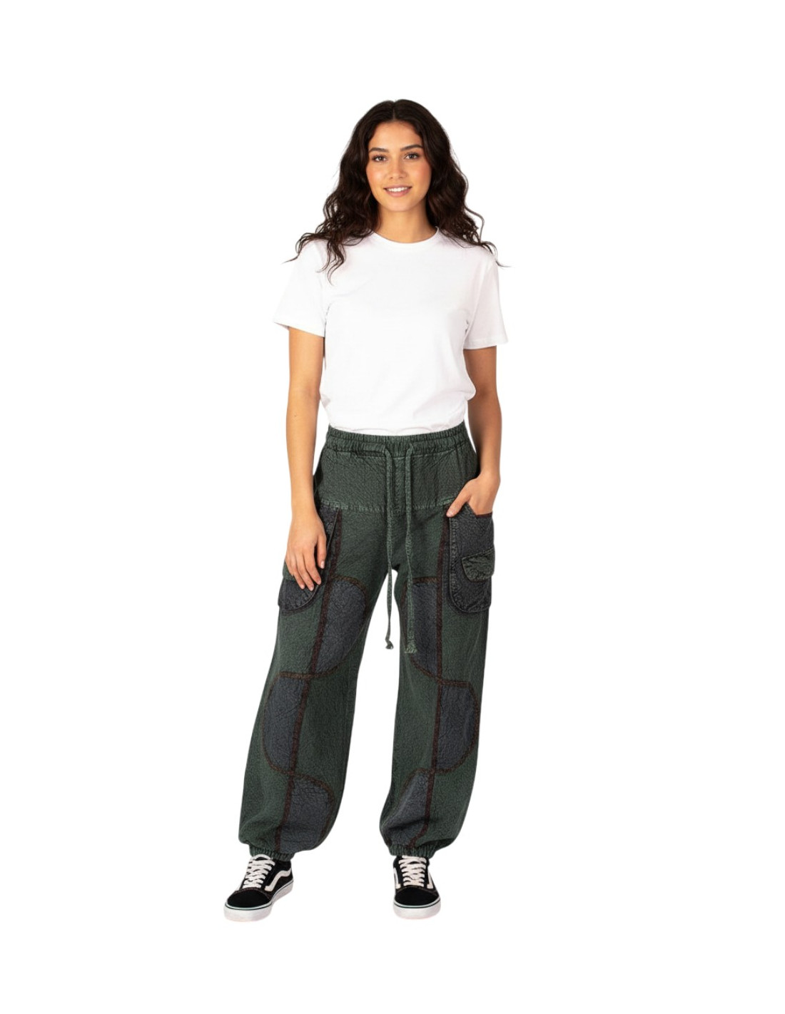 Unisex harem pants in green, made of cotton with a distressed effect, comfortable, roomy and adjustable for a bohemian and authentic look.