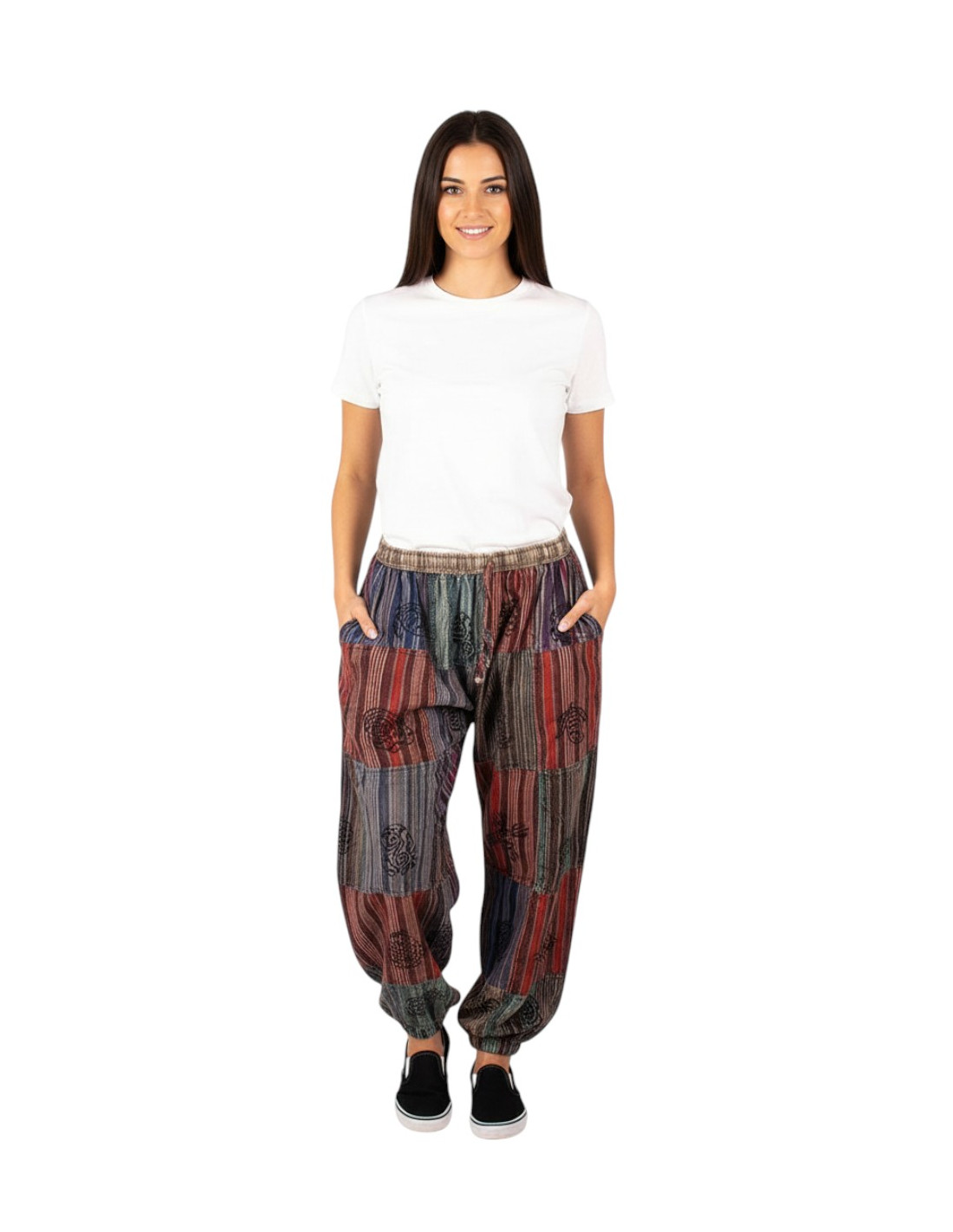 Discover the unisex patchwork harem pants in a variety of colors , an authentic, handcrafted garment inspired by Indian fashion . Made from high-quality cotton , they combine comfort, bohemian style, and originality in every piece.