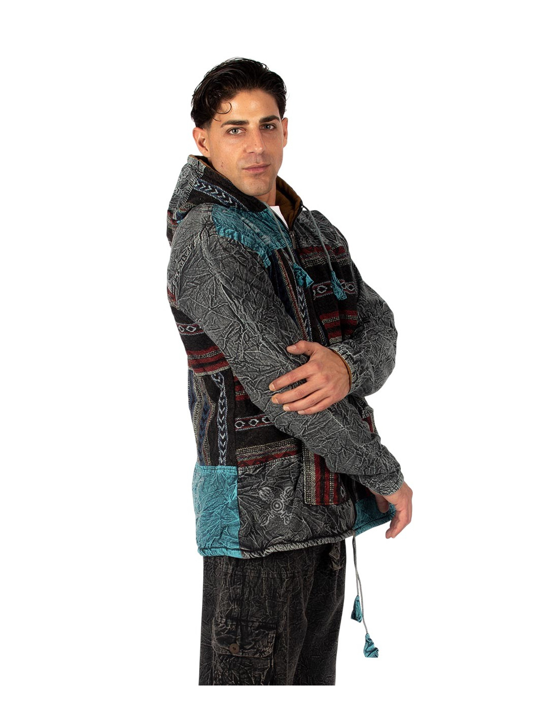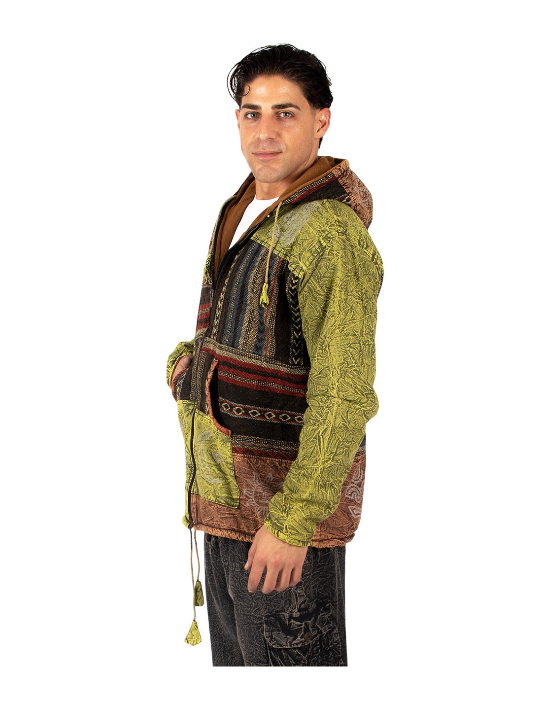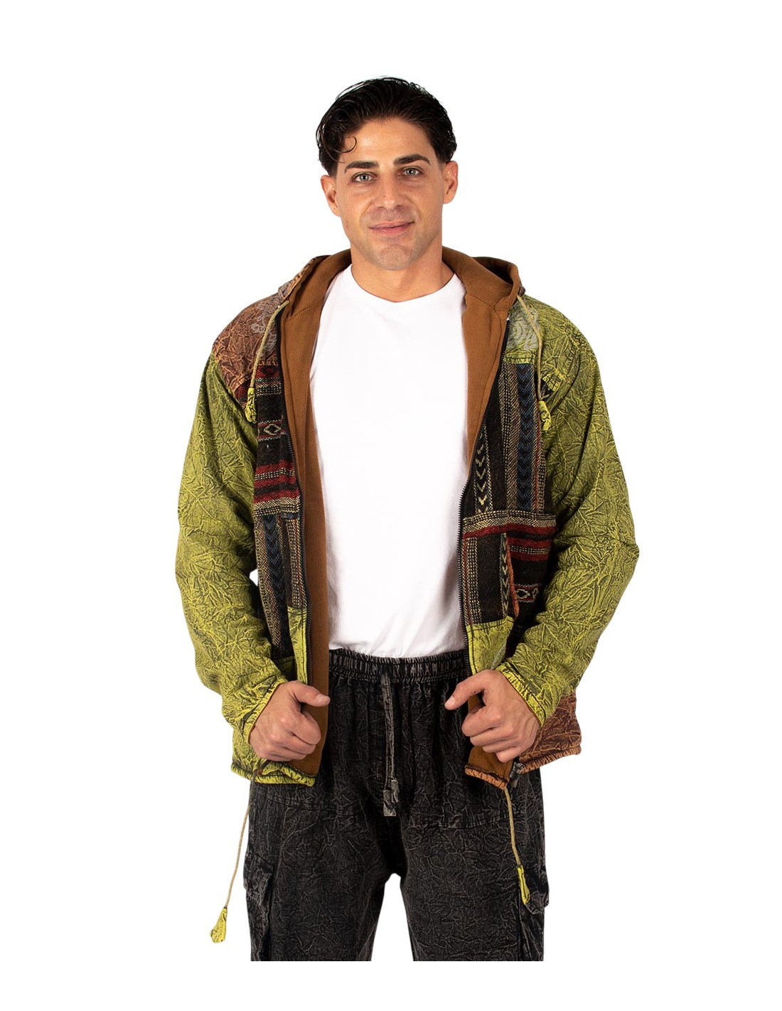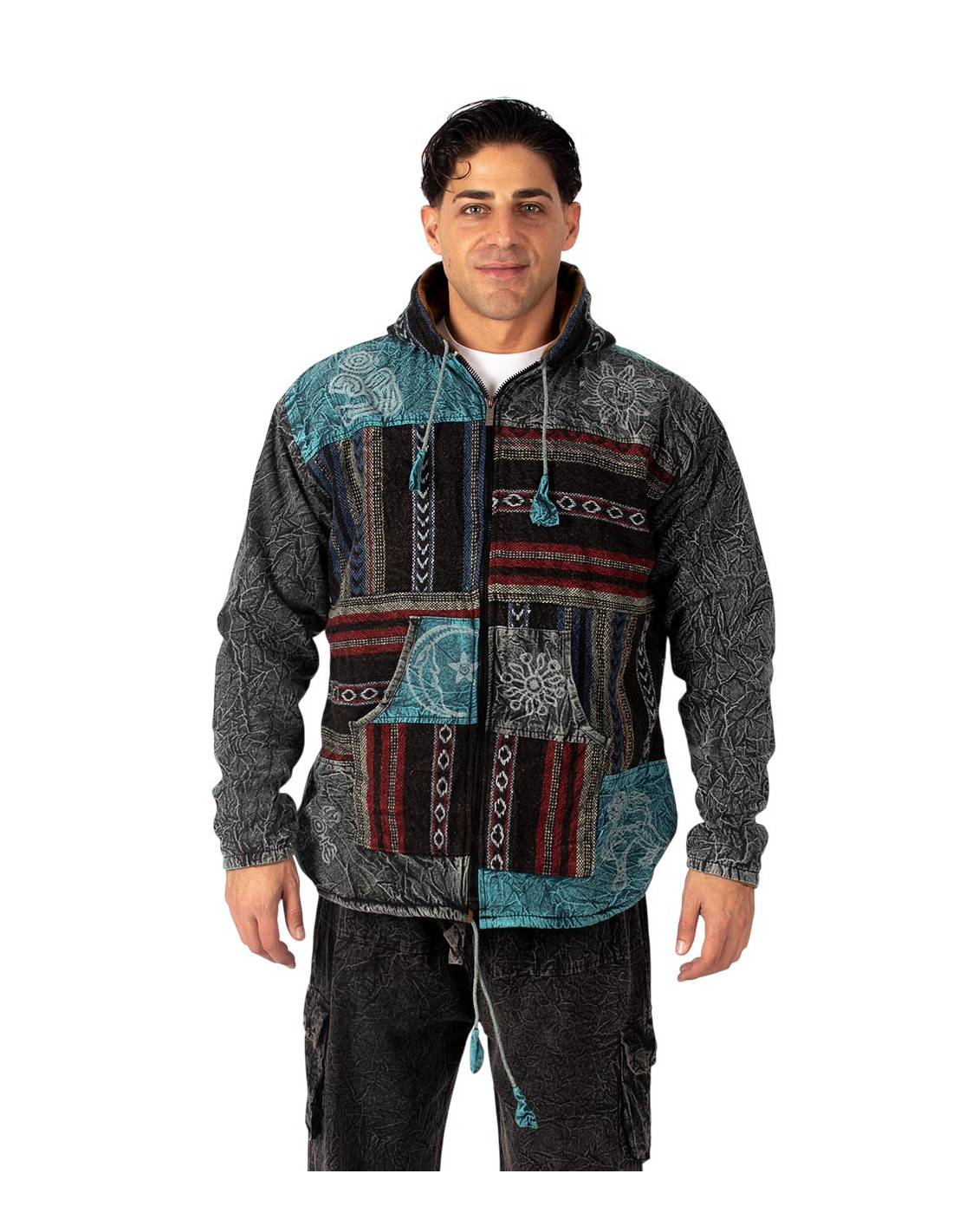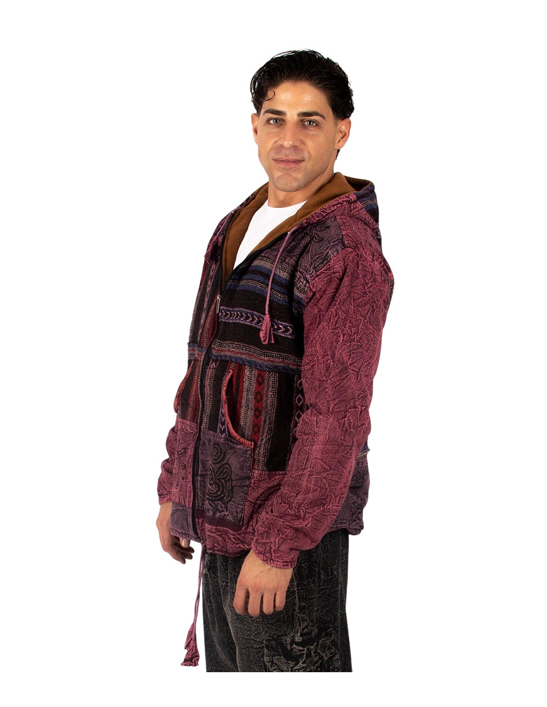 This handcrafted patchwork jacket with a fleece lining combines bohemian style with the warmth and comfort you need on cold days. Handmade in India, it features recycled cotton fabrics , carefully assembled in a unique and unrepeatable design that reflects the essence of Indian ethnic fashion .