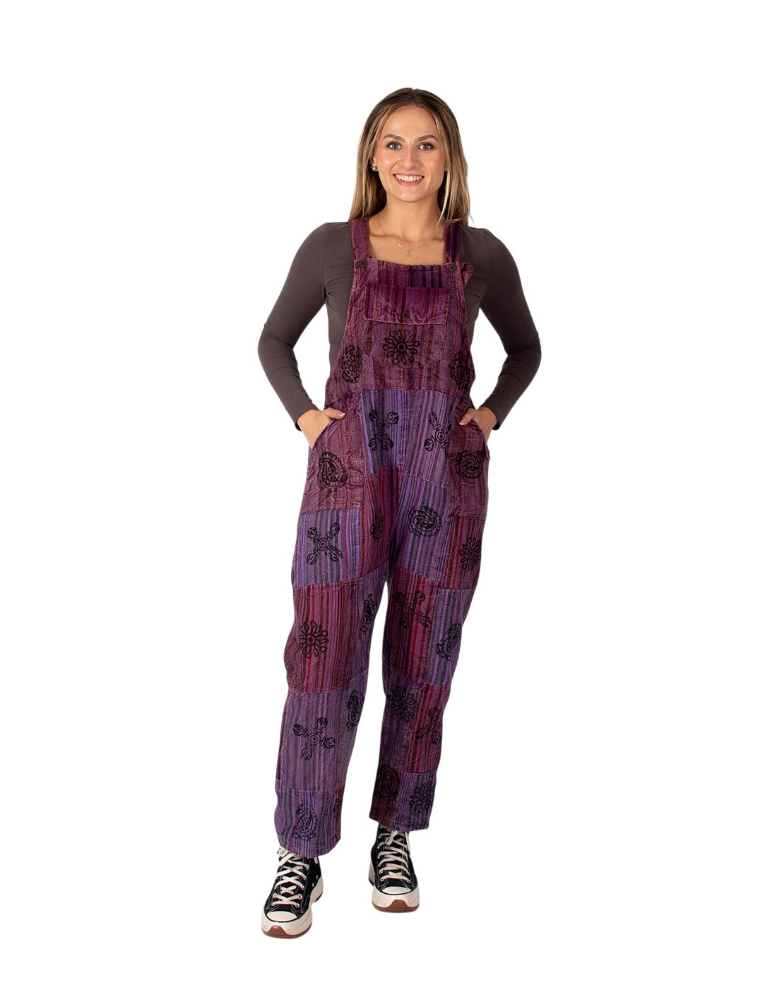 Unisex jumpsuit handmade in India from natural cotton using patchwork techniques. Available in shades of purple.