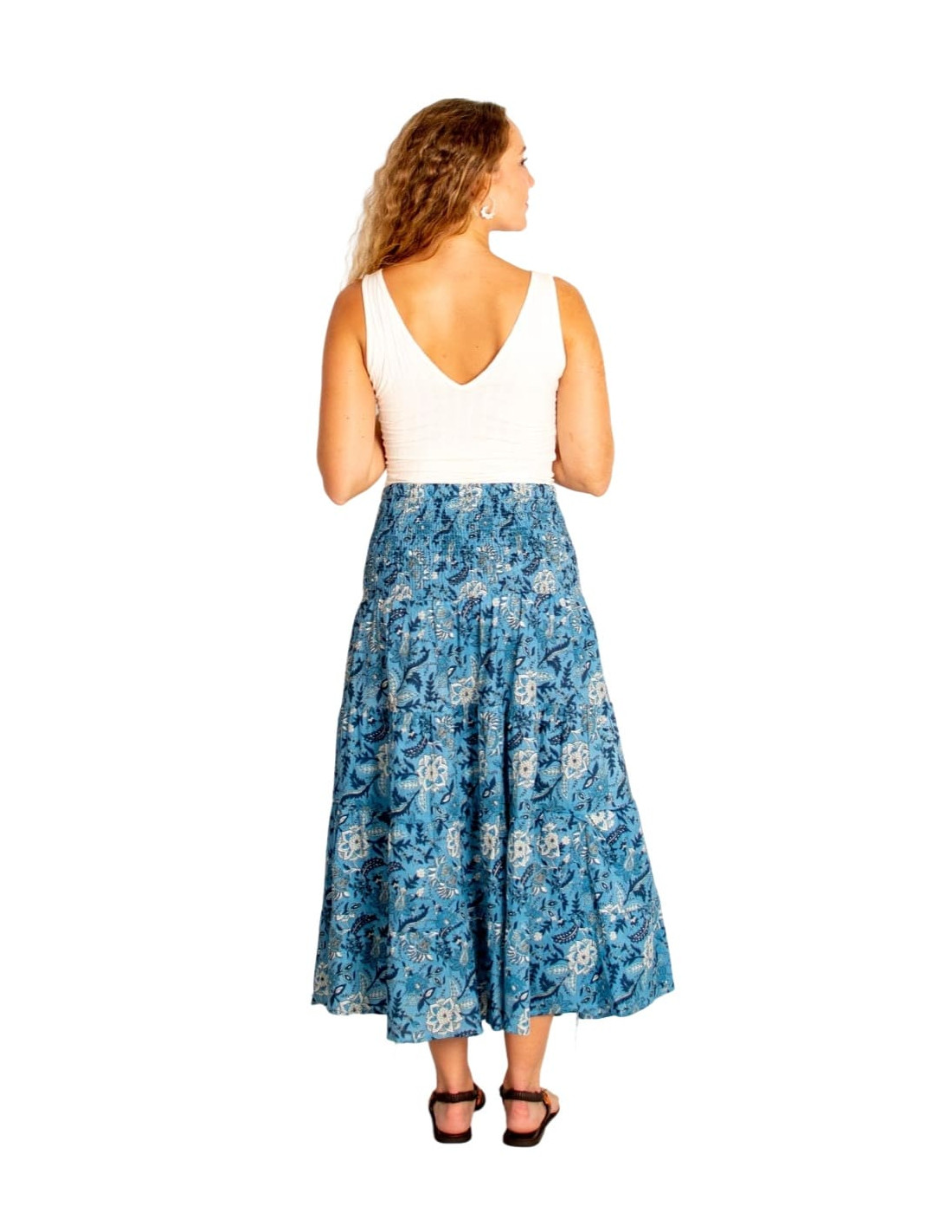 Long cotton skirt with a print in shades of light blue, white, and blue. A flowing, fresh, and comfortable design inspired by Indian ethnic fashion.