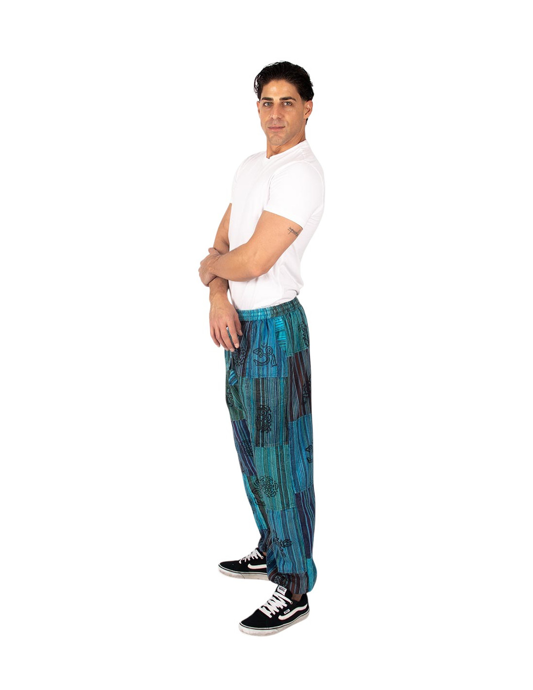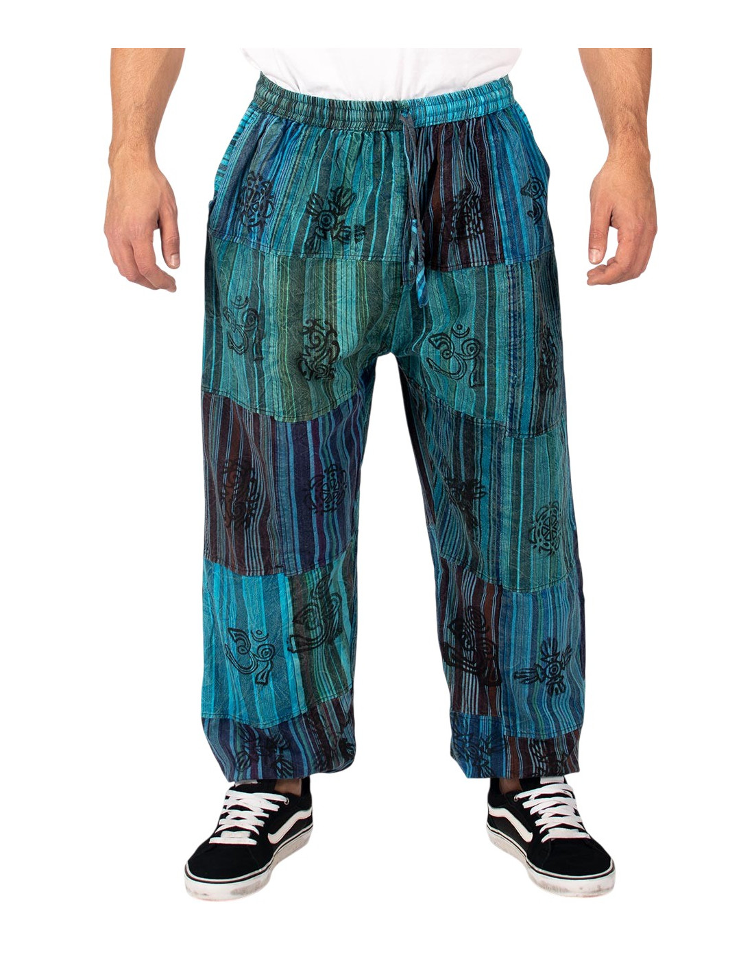 Discover these unisex patchwork harem pants in light blue , a garment that combines style, comfort, and authentic Indian ethnic fashion . Made from high-quality cotton , each pair is unique thanks to its handcrafted patchwork , where the placement of fabrics varies, adding exclusivity to your outfit.