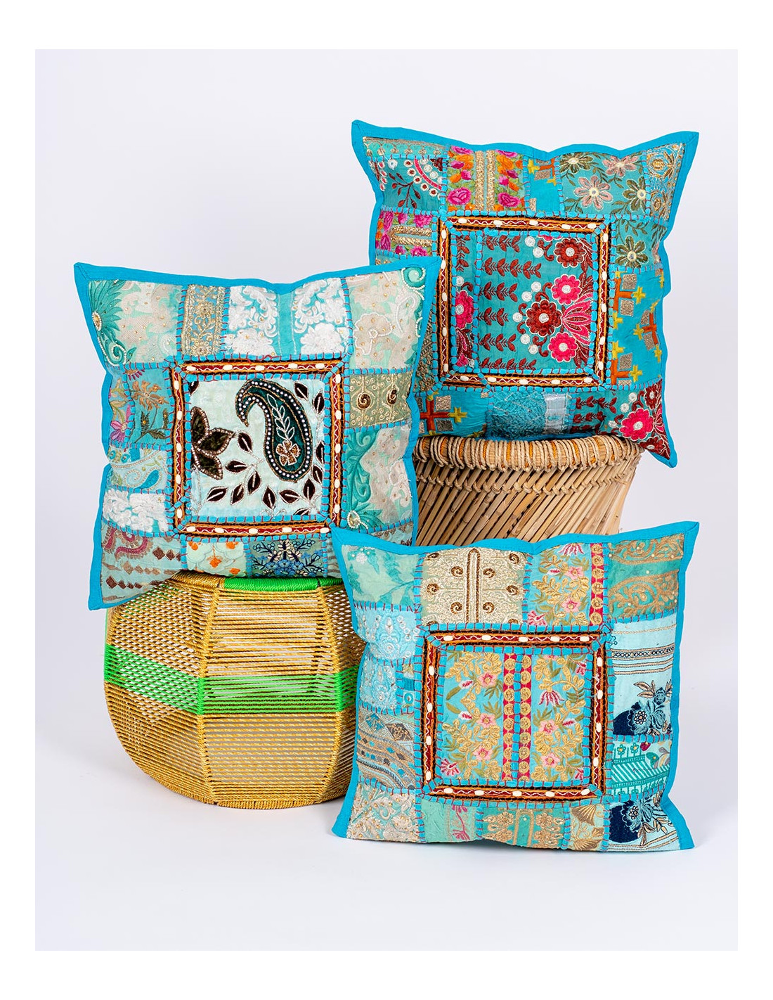 El frontal está compuesto por retales bordados con un delicado detalle de caracoles cocidos, mientras que la parte trasera mantiene un tono celeste uniforme, facilitando su integración con otros textiles o muebles. Los bordados manuales y la textura de los tejidos aportan carácter, profundidad y un acabado artesanal auténtico.