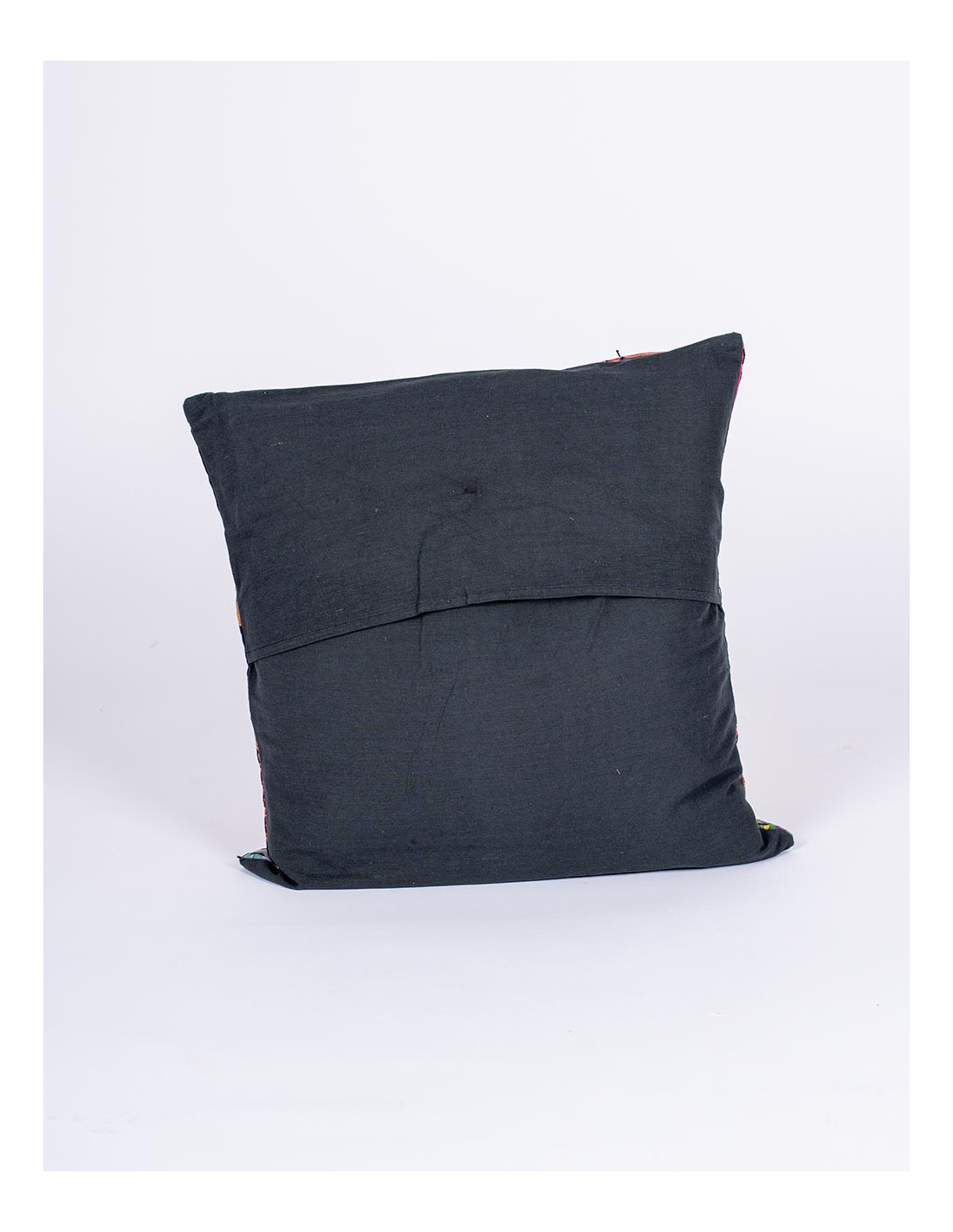 Los pespuntes decorativos añaden textura y un acabado artesanal único, resaltando el trabajo detallado que caracteriza a la decoración india. La parte trasera lisa, en el mismo tono negro, facilita su combinación con otros cojines o mantas en colores neutros o vibrantes.