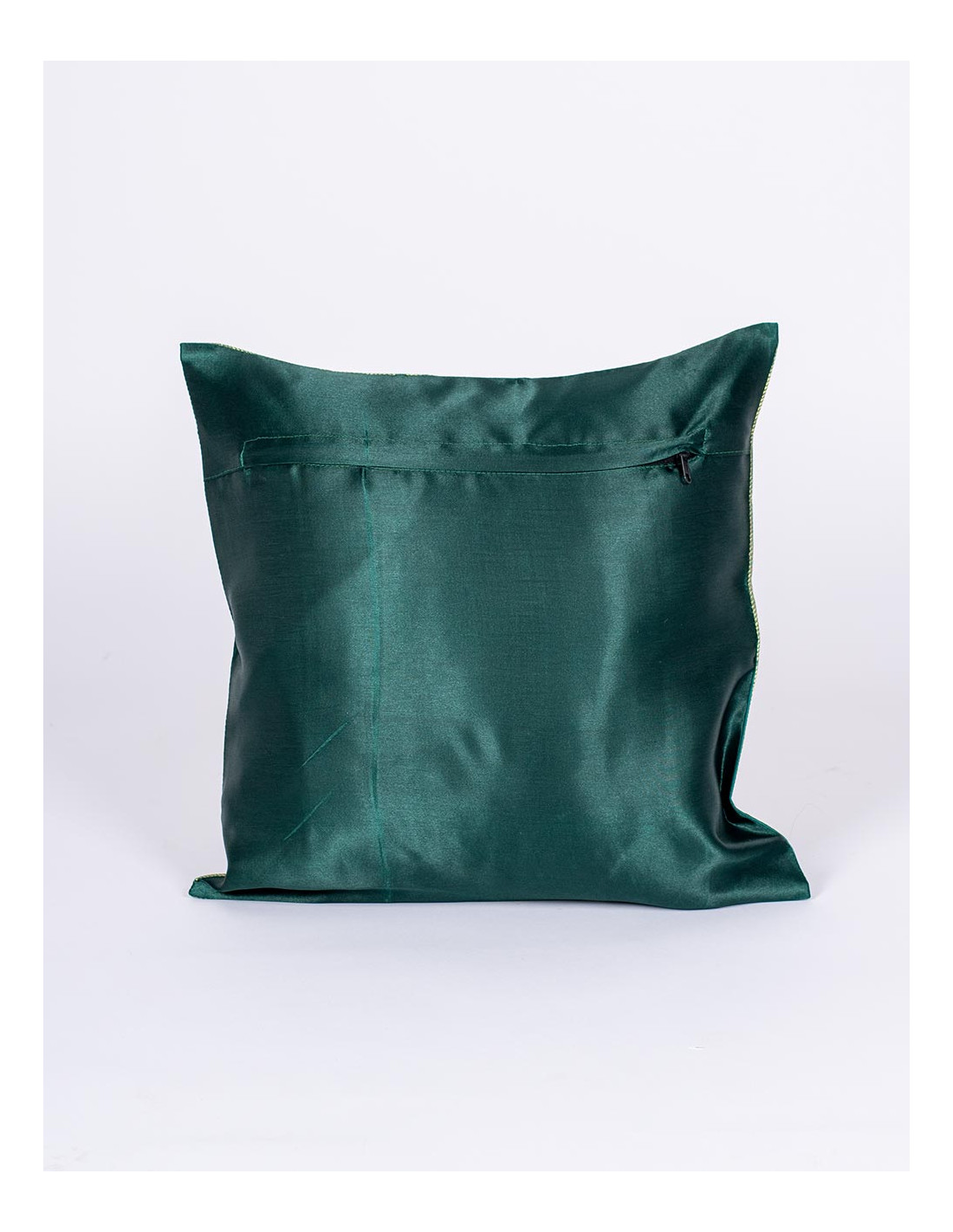 La parte trasera en verde liso mantiene la coherencia cromática y facilita su combinación con otros textiles. Además, incorpora cremallera posterior, que permite introducir el relleno cómodamente y retirarla con facilidad para su limpieza.