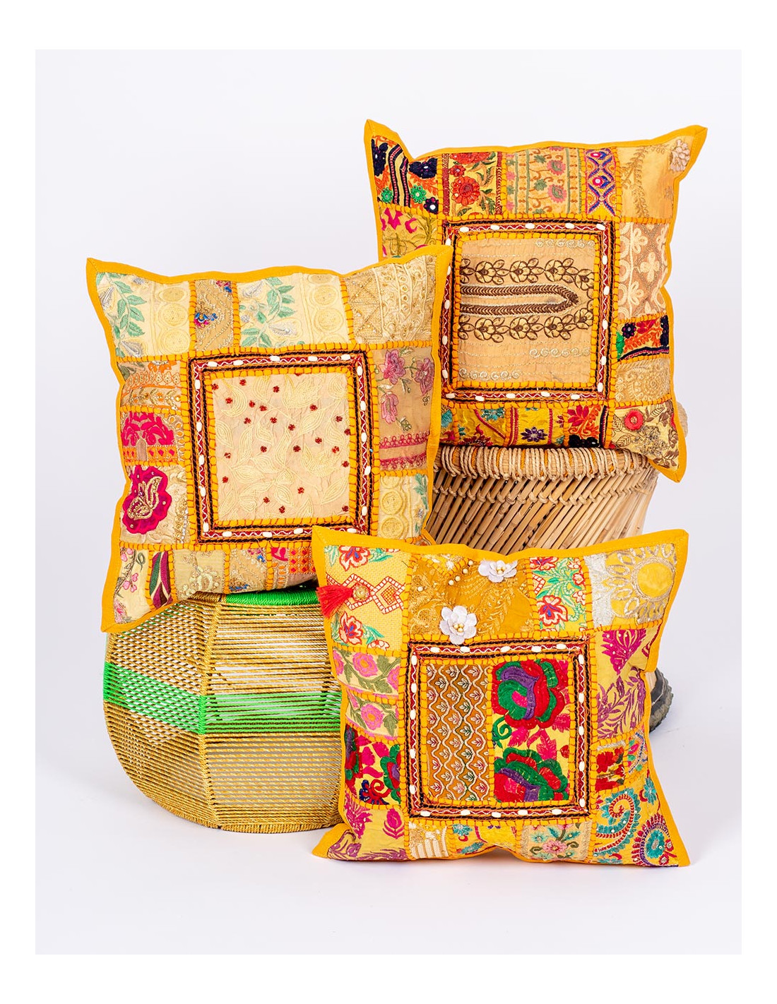 El diseño frontal incluye retales bordados con un pequeño cuadrado central decorado con caracoles cocidos, mientras que el marco y la parte trasera mantienen un tono amarillo uniforme, facilitando la combinación con otros textiles. Cada funda es diferente en los detalles de los tejidos, haciendo que cada unidad sea exclusiva y auténtica.