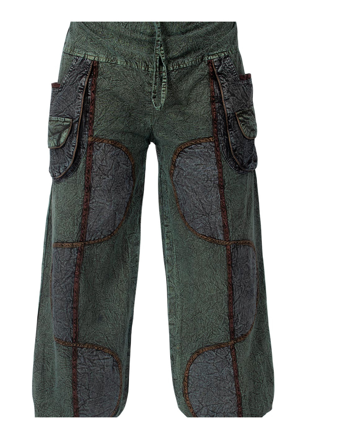 Pantalón bombacho unisex en color verde, confeccionado en algodón con efecto desgastado, cómodo, amplio y ajustable para un look bohemio y auténtico.