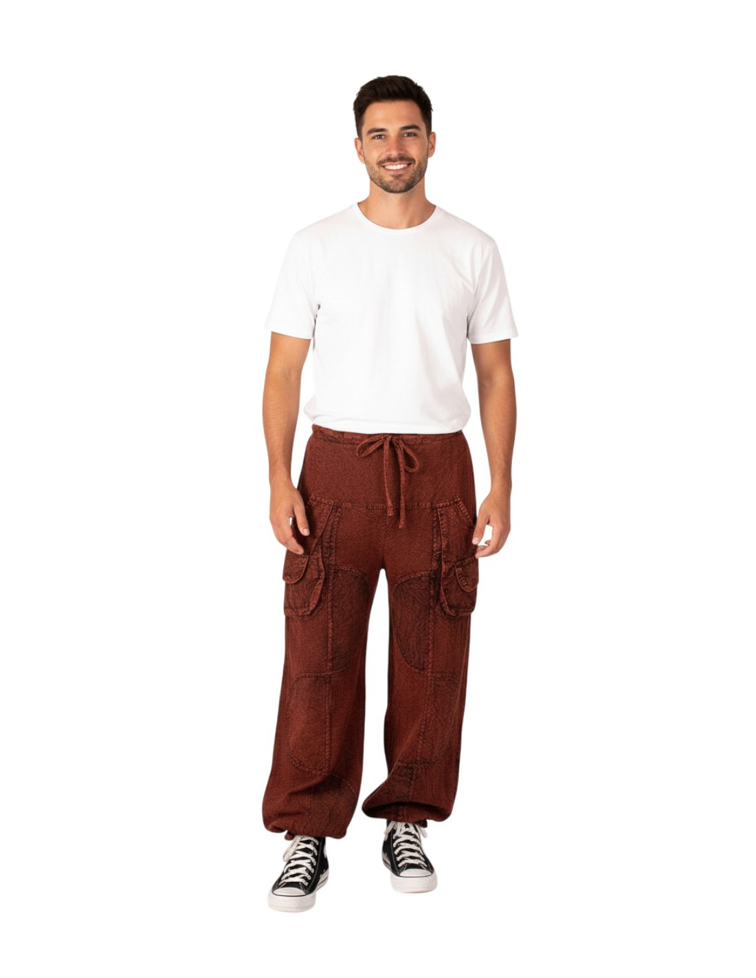 Este pantalón bombacho unisex en color burdeos es una prenda imprescindible para quienes buscan comodidad, estilo alternativo y autenticidad en cada detalle. Fabricado en algodón de alta calidad y tratado con la técnica artesanal cotton blast, ofrece un efecto desgastado único que aporta carácter y un aire bohemio muy propio de la moda india.