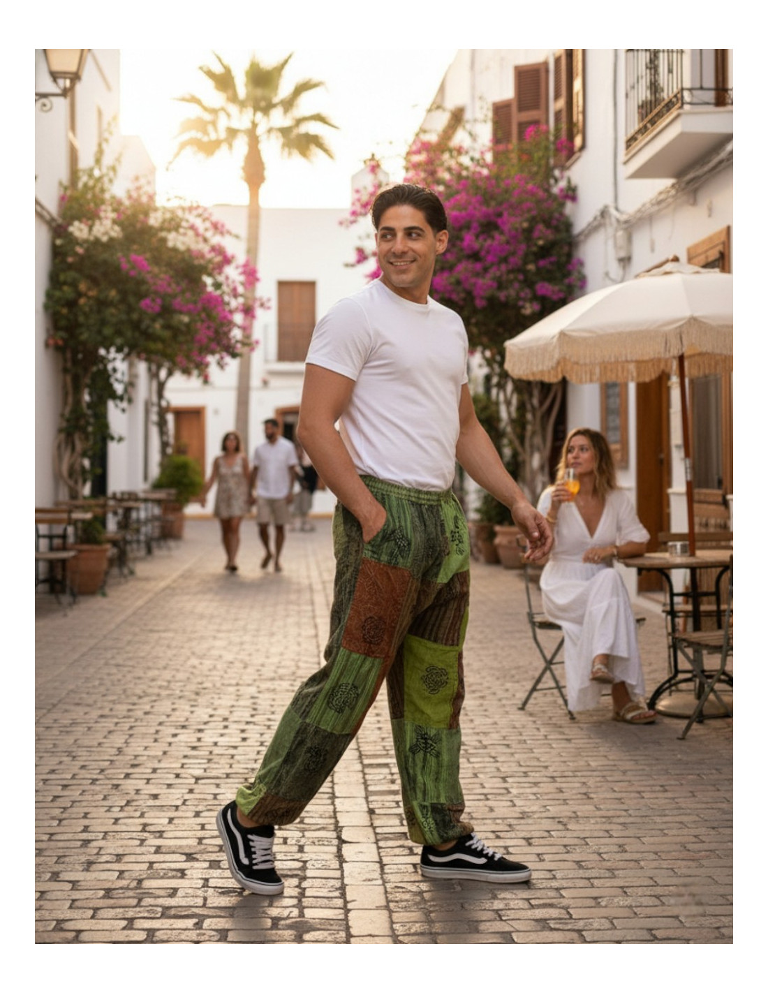 El pantalón destaca por su cintura y tobillos con goma, que proporcionan un ajuste cómodo y seguro, mientras que el lazo decorativo en la cintura añade un toque estético y práctico. Los bolsillos laterales completan la funcionalidad sin perder el estilo. A pesar de que en la foto lo luzca un hombre, esta prenda es totalmente unisex, ideal para cualquier silueta y para quienes buscan un look alternativo, bohemio y con carácter.