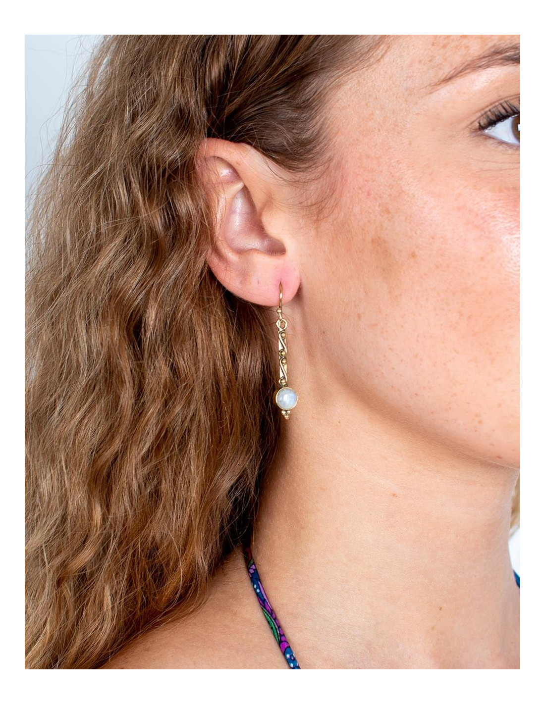 Fabricados en latón dorado y cuidadosamente tallados a mano, presentan un diseño alargado con detalles que evocan la tradición artesanal de la India. En el extremo de cada pendiente se incorpora una piedra mineral natural diferente, aportando autenticidad y una energía especial a cada par.