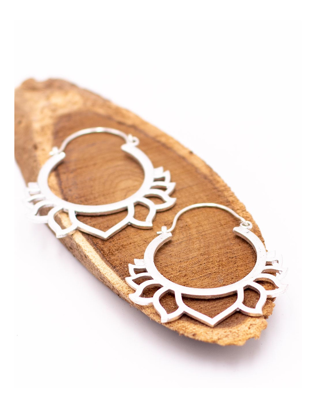 Fabricados a mano en latón (mezcla de cobre y zinc) por artesanos locales, presentan un diseño circular del que cuelgan delicados pétalos de flor de loto, símbolo de pureza, armonía y renovación. Su acabado plateado aporta un toque elegante y atemporal, ideal para quienes buscan accesorios con alma y significado.