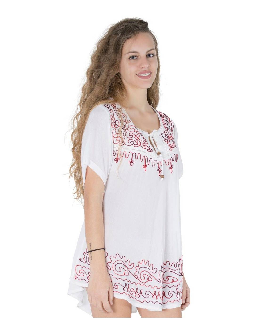 Il a des broderies sur la poitrine et sur le bas de trois couleurs différentes de votre choix.
