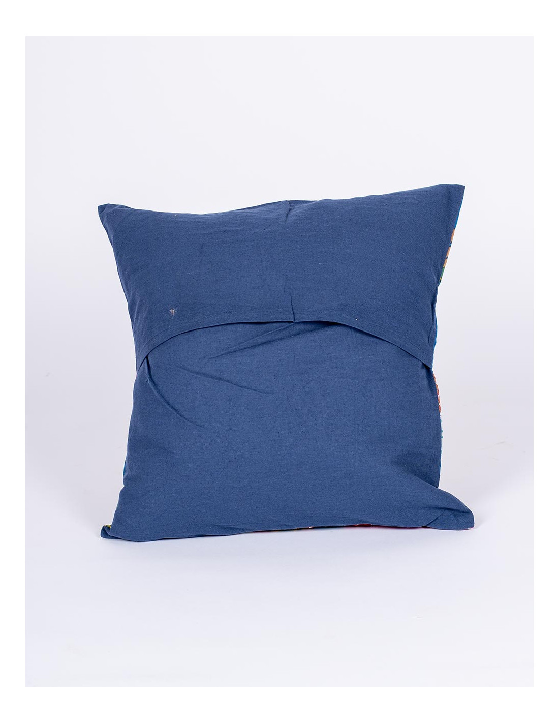 Les surpiqûres décoratives rehaussent sa finition artisanale, lui conférant texture et un aspect unique qui la distingue des coussins classiques. Son envers lisse, de la même nuance de bleu, lui permet de s'harmoniser facilement avec les autres textiles du salon ou de la chambre.