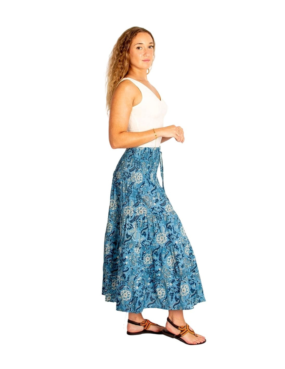 Jupe longue en coton avec un imprimé dans les tons bleu clair, blanc et bleu. Un modèle fluide, frais et confortable, inspiré de la mode ethnique indienne.