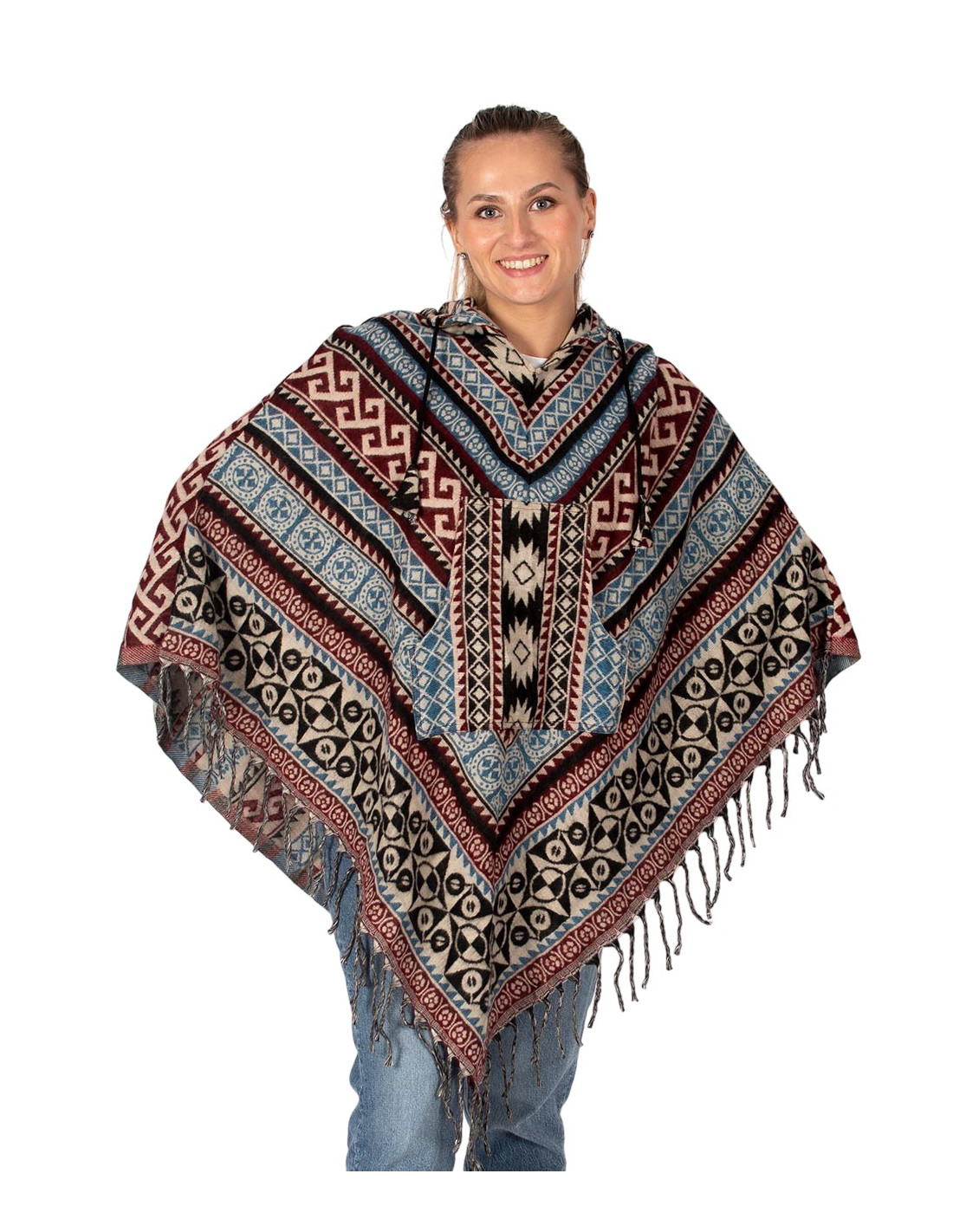 Poncho unisexe d'inspiration ethnique, doté d'une capuche ajustable , de franges sur le devant et de poches intégrées. Sa texture est douce, chaude et rappelle celle de la laine.