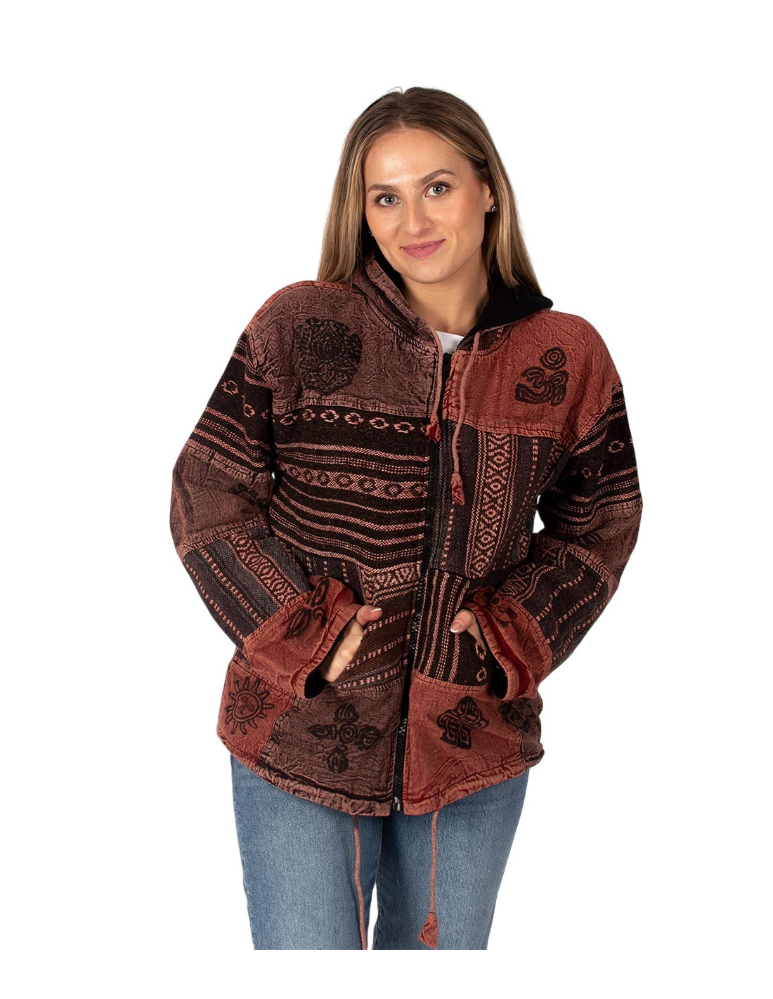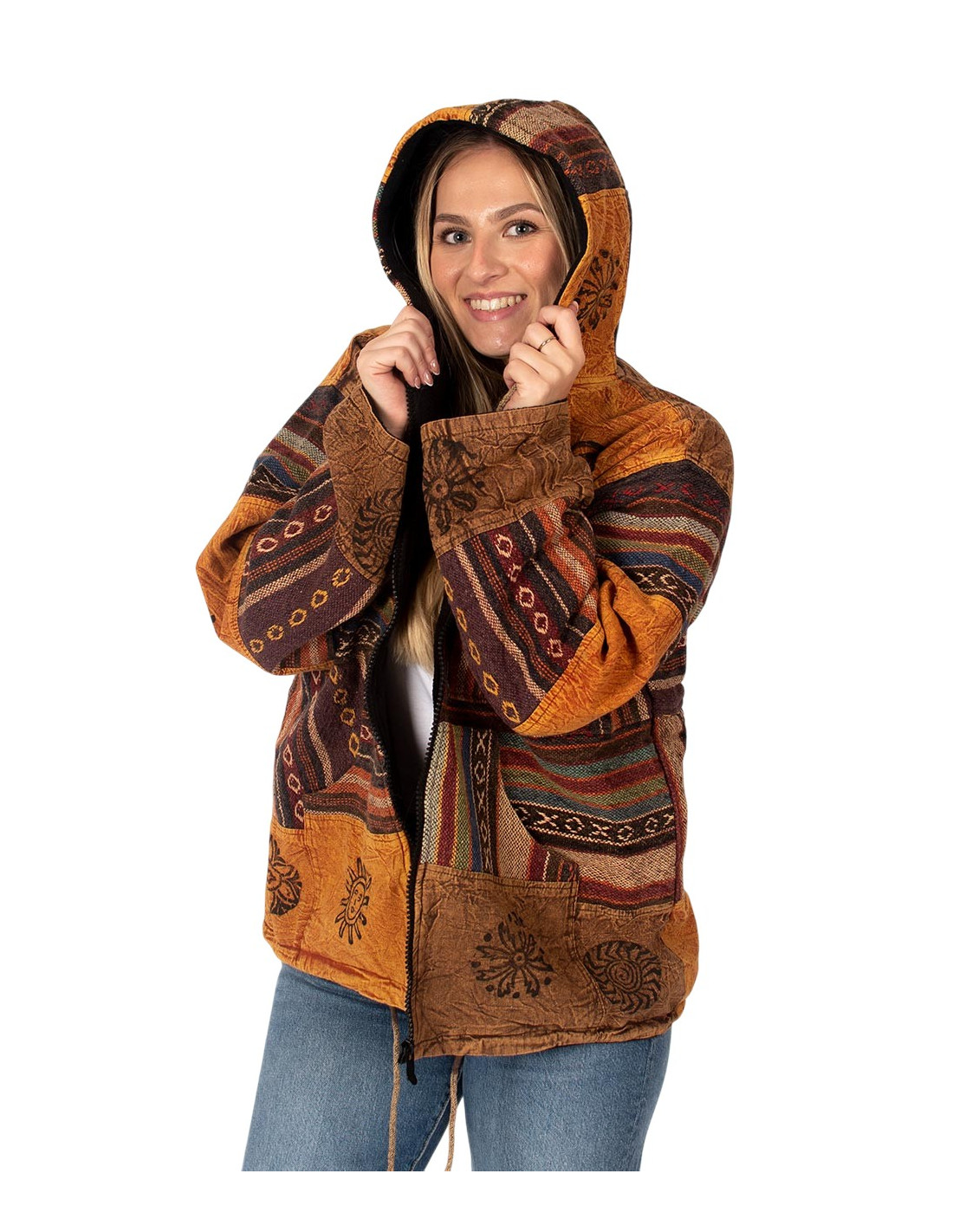 Elle est dotée d'une fermeture éclair centrale, d'une capuche ajustable et de deux poches fonctionnelles , ajoutant confort et praticité au style bohème caractéristique de Kimago .