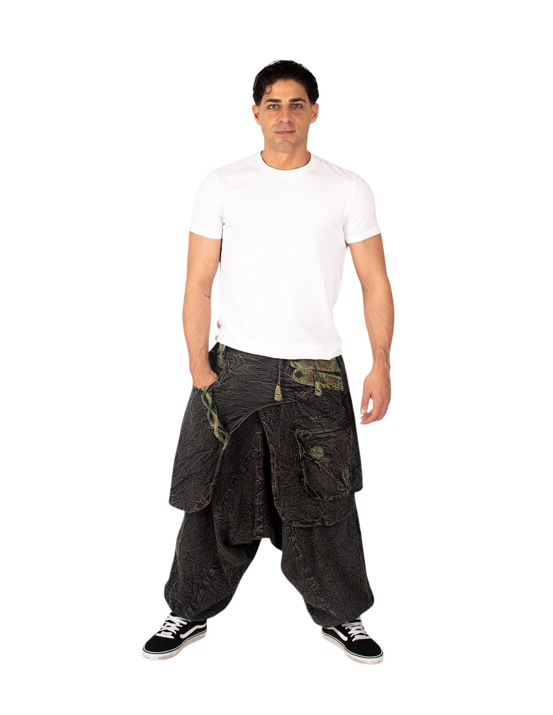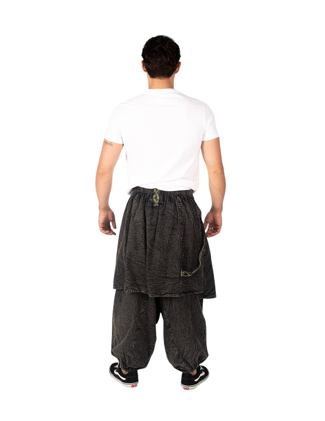 Pantalon afghan en coton gris à effet usé, détails verts et jupe croisée.
