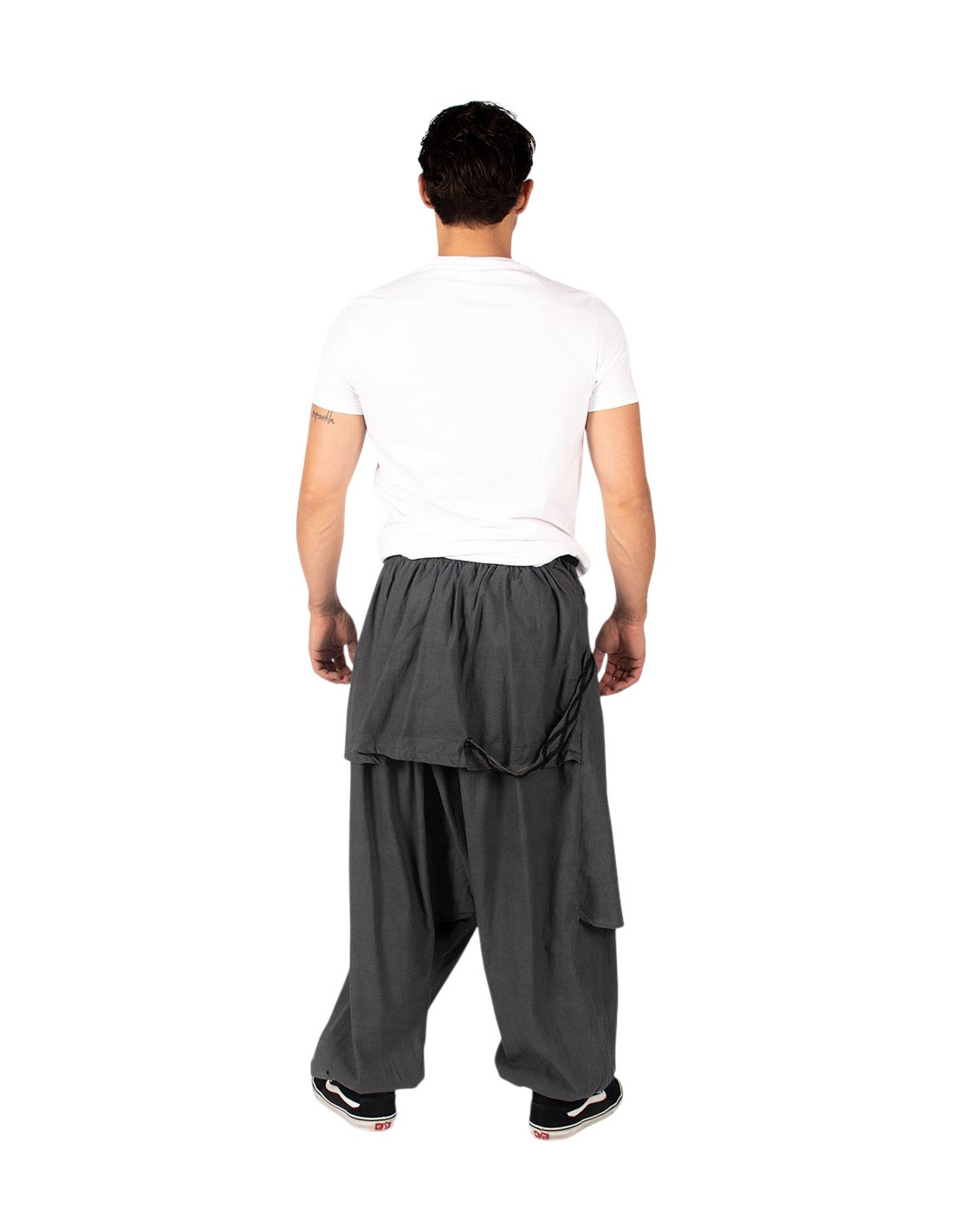 Pantalon afghan en coton gris à ourlet asymétrique et symbole Om