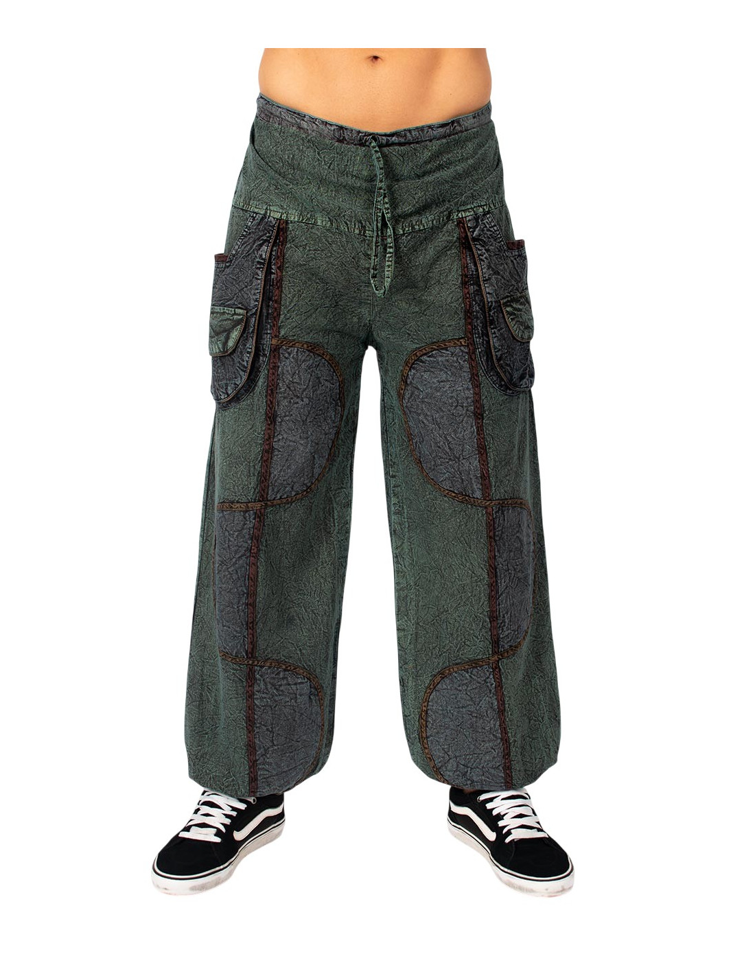 Pantalon sarouel unisexe en coton à effet vieilli, coutures décoratives et coupe confortable.