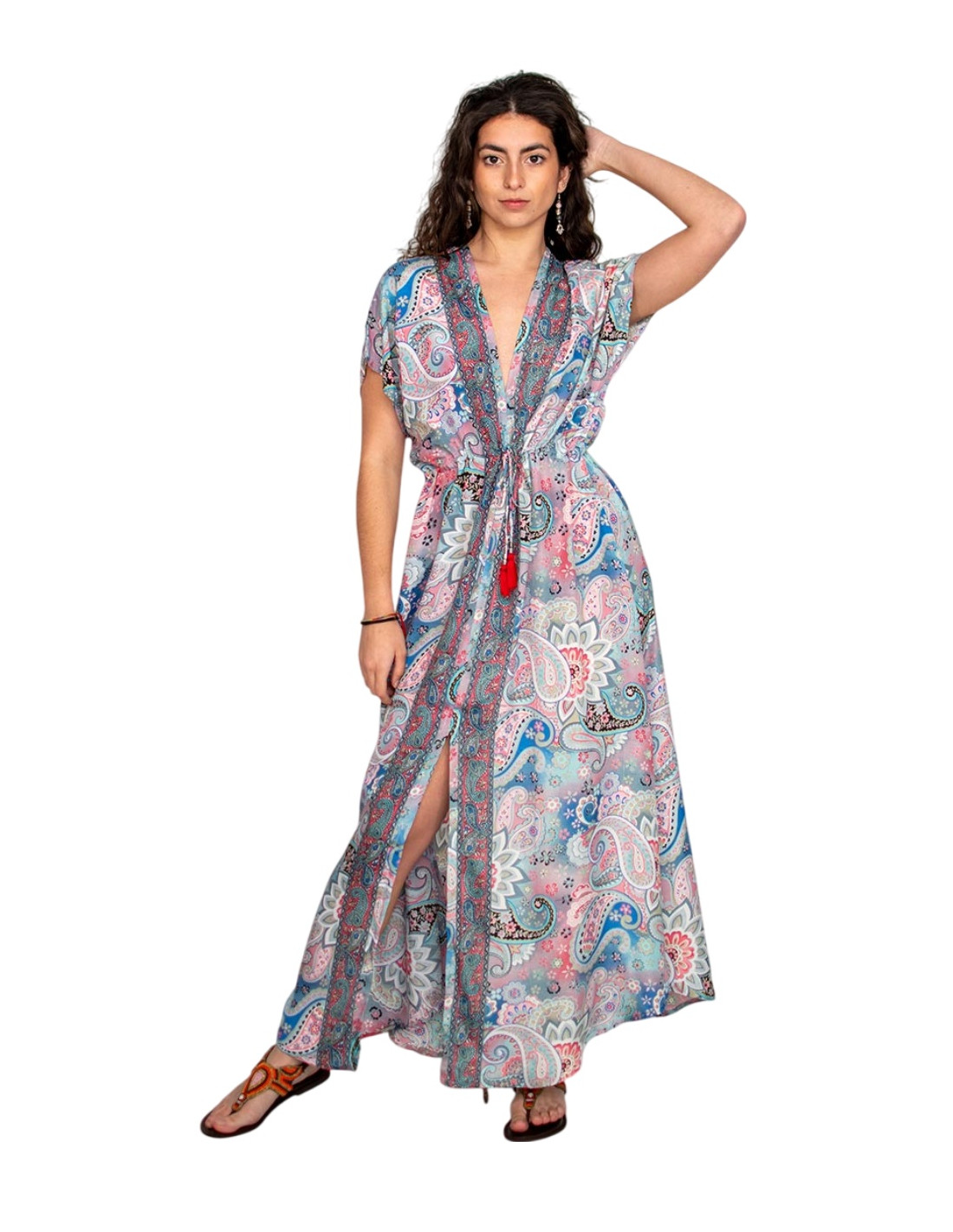 Robe longue d'inspiration indienne avec un imprimé délicat dans des tons bleu clair et rose. Tissu fluide, décolleté en V, pompons décoratifs et style bohème chic.