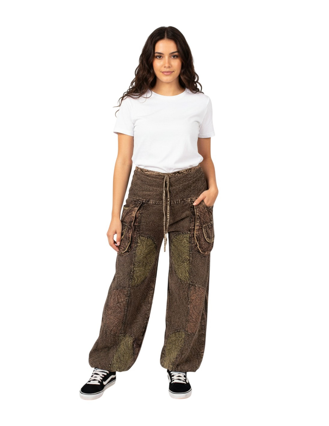 Questi pantaloni harem unisex in cotone , realizzati a mano in India, uniscono comfort, stile etnico e un tocco bohémien, perfetti per l'uso quotidiano. Realizzati in cotone trattato con la tecnica Cotton Blast , offrono un effetto vissuto che ne esalta il carattere autentico e alternativo.