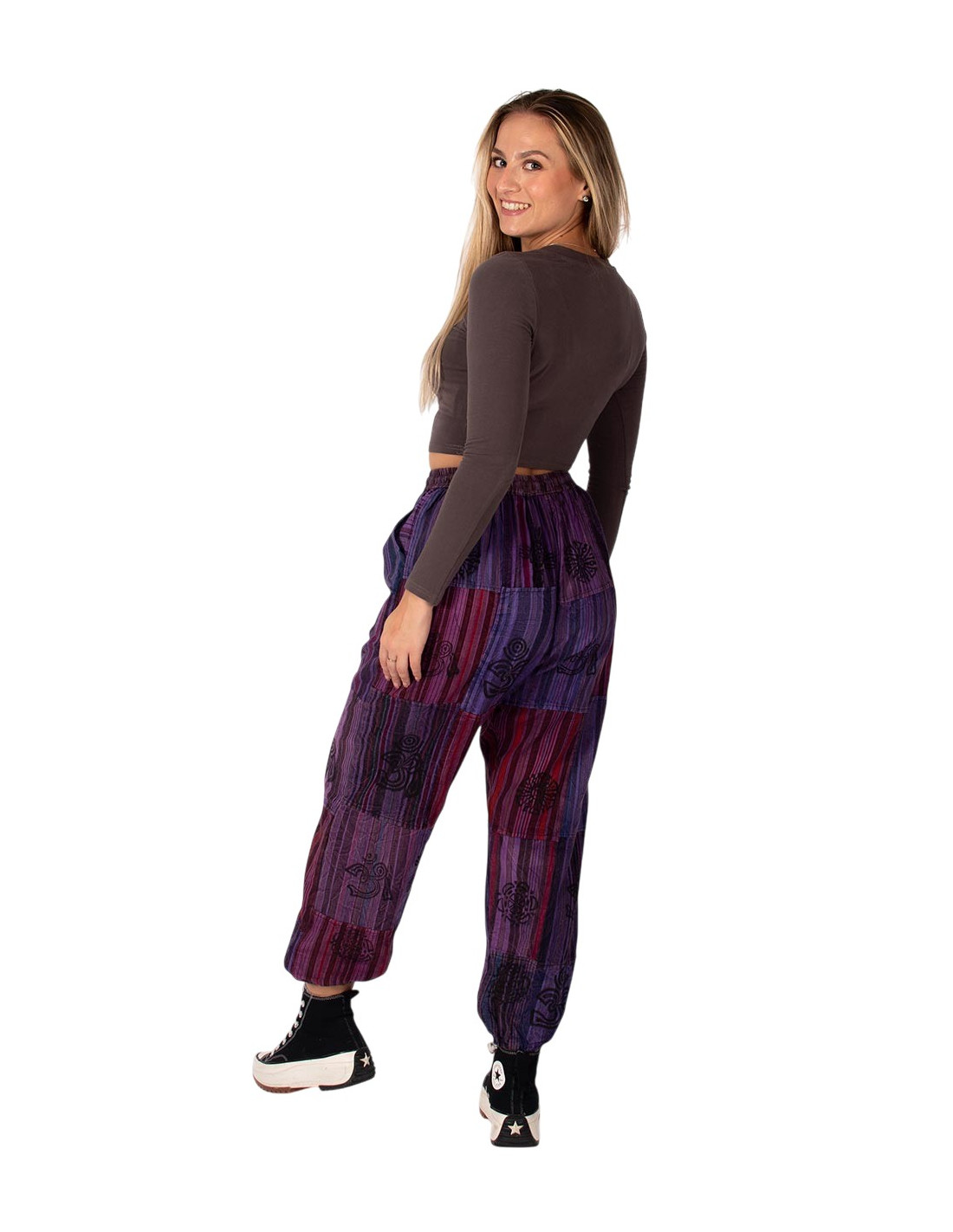 Pantaloni harem unisex in cotone con un esclusivo motivo patchwork, disponibili in azzurro o viola. Taglia unica, con elastico in vita e alle caviglie, tasche laterali e fiocco decorativo. Ogni pezzo è fatto a mano ed è unico. La modella è alta 1,68 m.