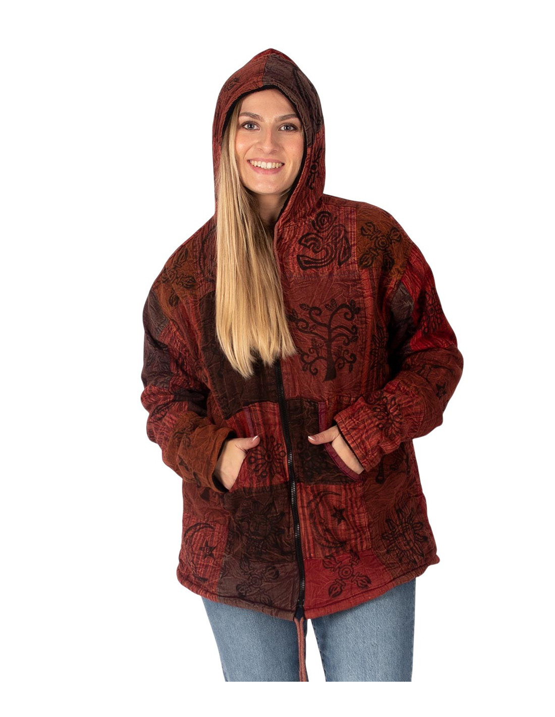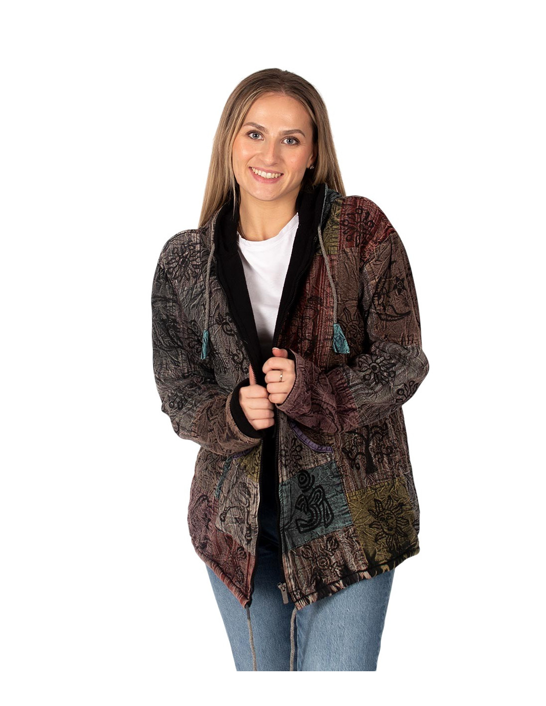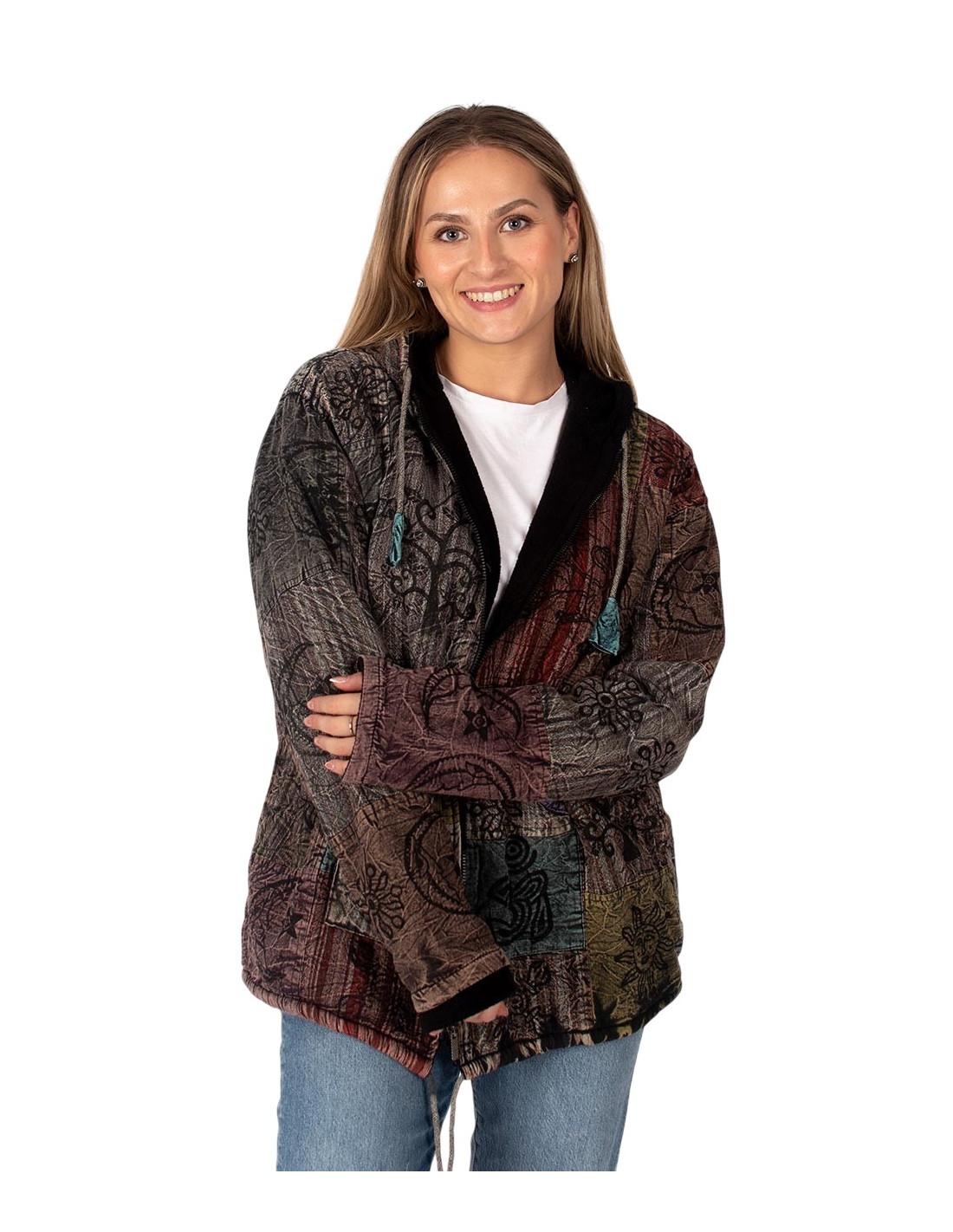 Giacca etnica patchwork unisex con fodera in pile e cappuccio