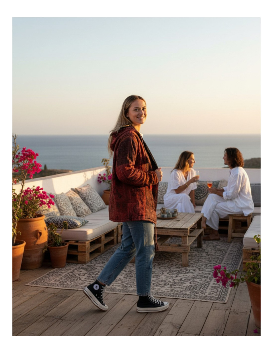 Il suo design combina colori e stampe tradizionali in un armonioso mix di texture ispirate alla cultura indiana. Il cappuccio con coulisse , la cerniera frontale e le pratiche tasche laterali lo rendono comodo e pratico, perfetto per l'uso quotidiano o per aggiungere un tocco bohémien ai tuoi outfit.