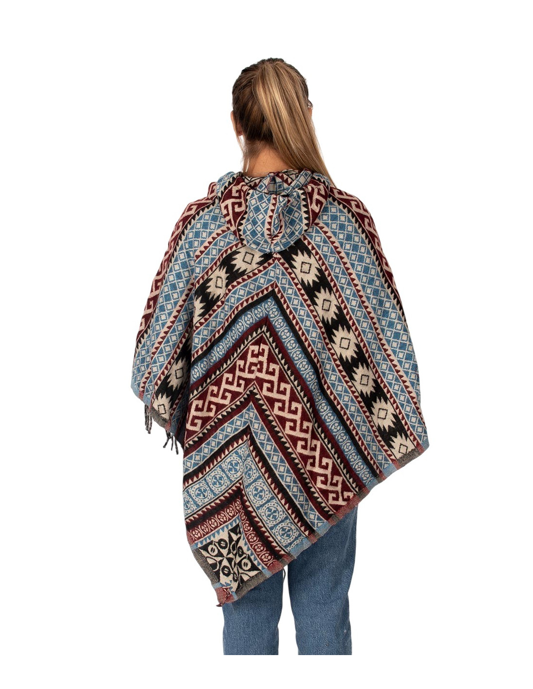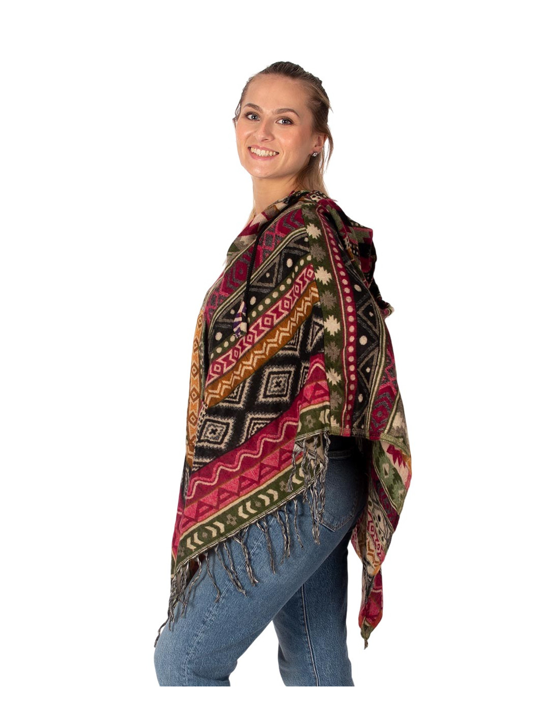 Poncho unisex di ispirazione etnica, con cappuccio regolabile , frange frontali e tasche applicate. Presenta una texture morbida e calda, simile alla lana.