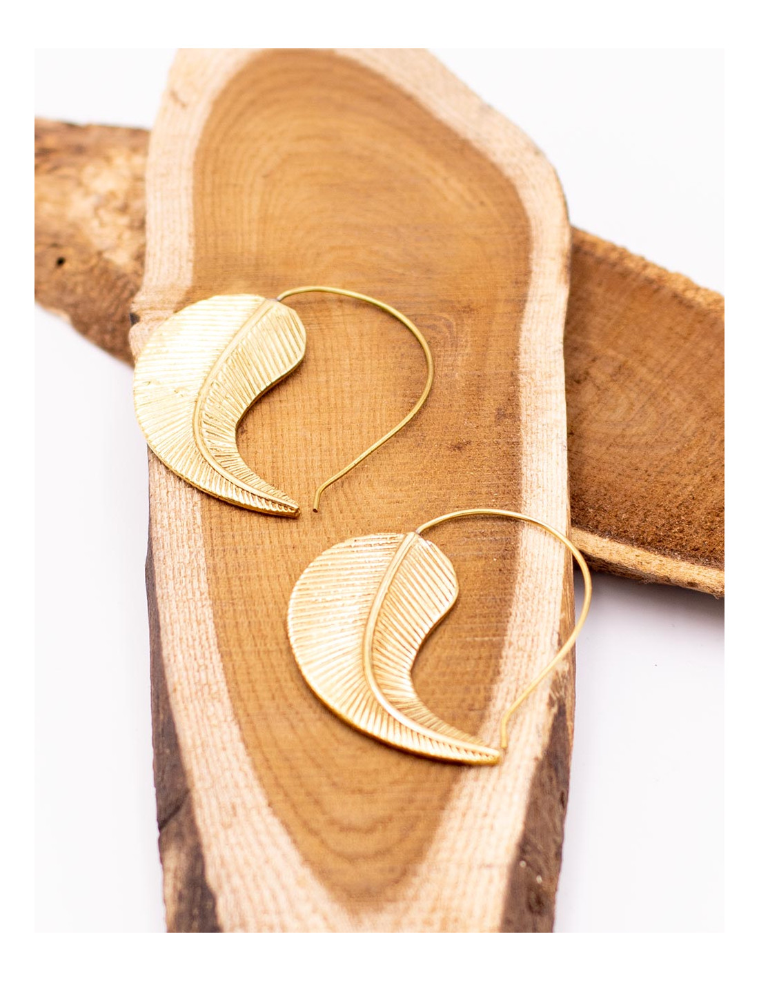 Orecchini artigianali a forma di foglia, realizzati in ottone placcato oro con dettagli intagliati a mano.