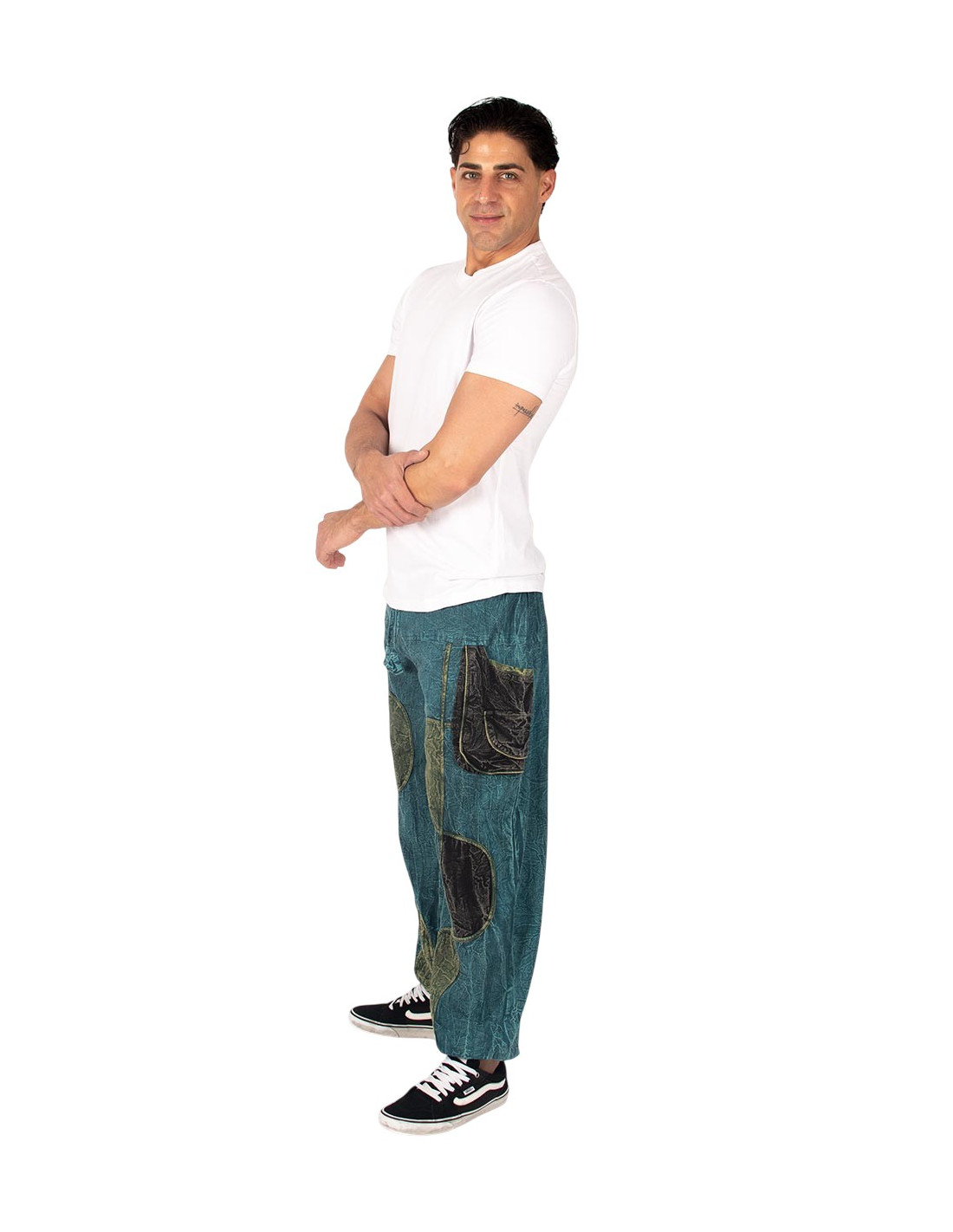 Pantaloni harem unisex in cotone con effetto consumato, design artigianale e vari colori.