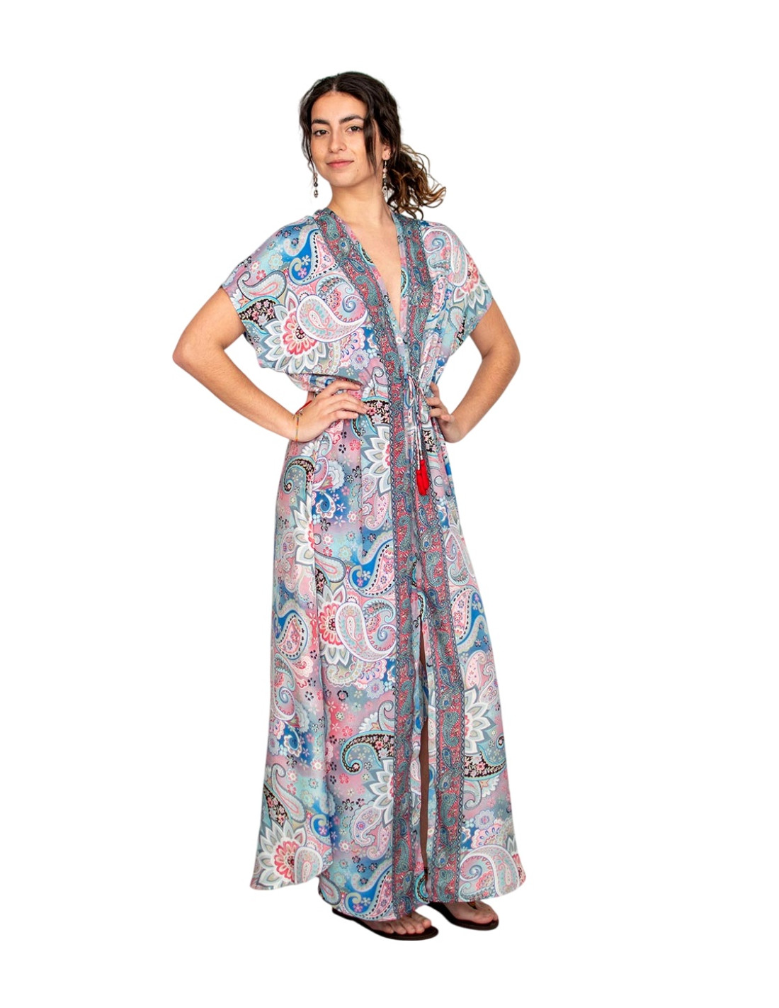 Disegnato in India, questo abito si distingue per la sua stampa dai toni chiari , dove predominano l'azzurro chiaro e il rosa chiaro , due colori che donano luce e delicatezza senza rinunciare al carattere.