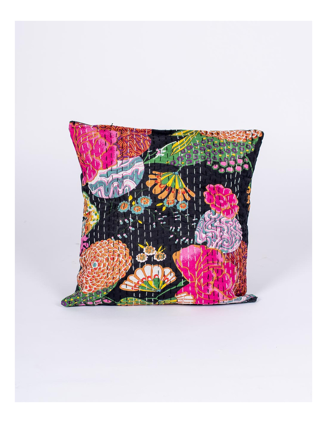 A costura decorativa adiciona textura e um acabamento artesanal único, realçando o trabalho detalhado que caracteriza a decoração indiana. O verso liso, no mesmo tom preto, facilita a combinação com outras almofadas ou mantas em cores neutras ou vibrantes.