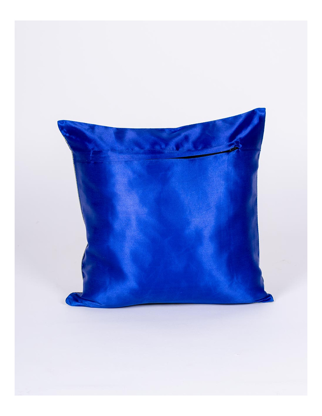 A parte de trás lisa em azul mantém uma estética equilibrada e facilita a combinação com outros tecidos. Possui também um zíper na parte de trás , permitindo a fácil colocação e remoção para lavagem.