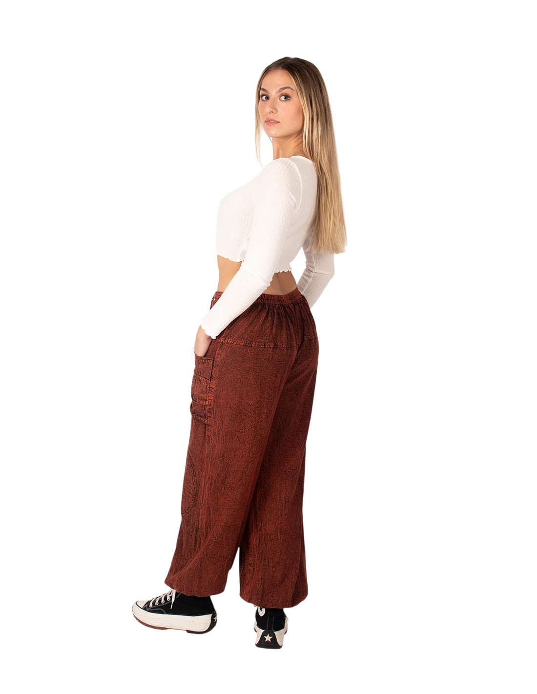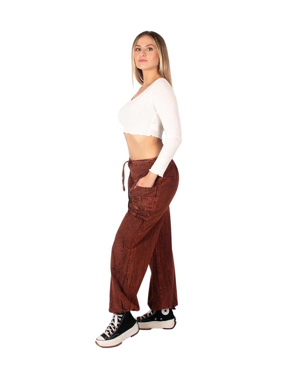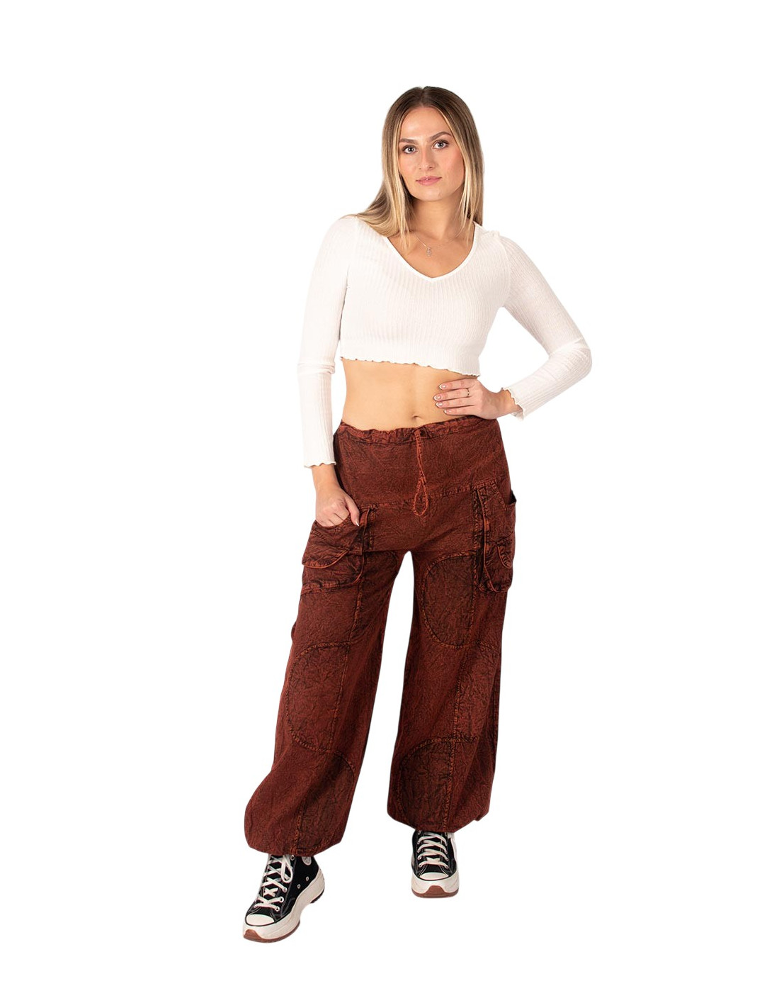 Calças harém unissex na cor bordô, confeccionadas em algodão com efeito desgastado, confortáveis, amplas e ajustáveis para um visual boêmio e artesanal.