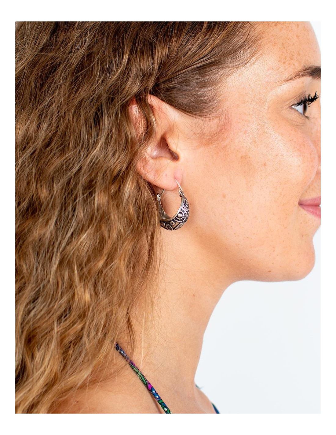 Adicione um toque de elegância étnica e estilo boho à sua coleção de acessórios com estes brincos circulares banhados a prata, feitos à mão na Índia . Feitos em latão de alta qualidade (cobre e zinco) , cada peça é cuidadosamente esculpida por artesãos indianos, garantindo um acabamento único e detalhado.