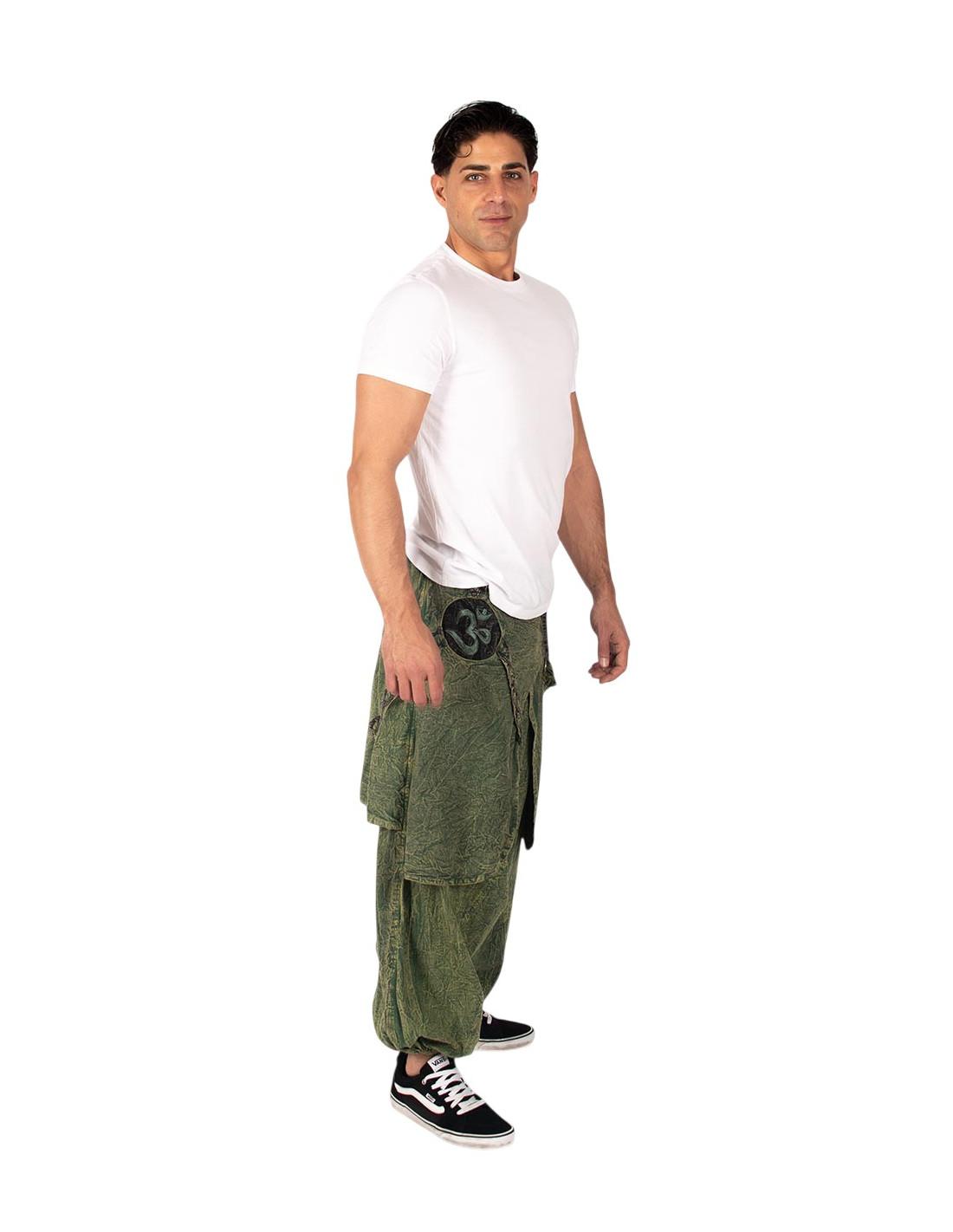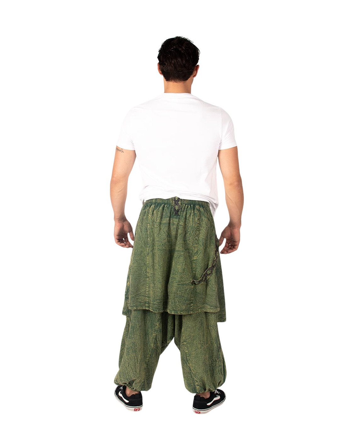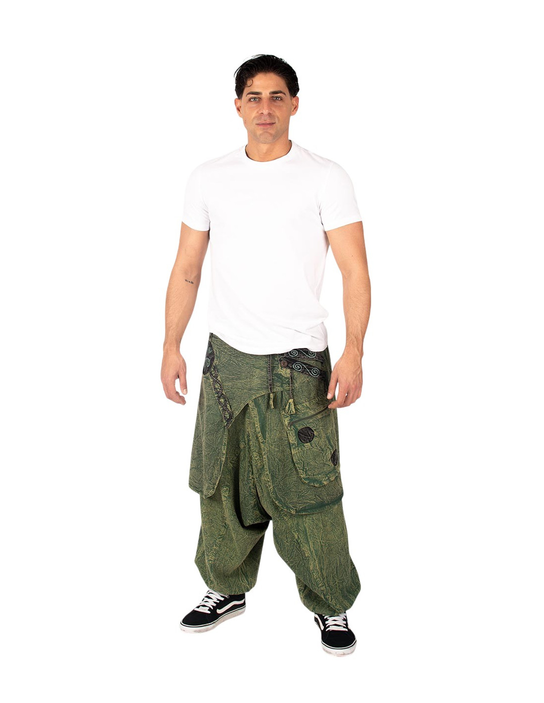 Calças afegãs de algodão com efeito desgastado, saia sobreposta e símbolo Om.