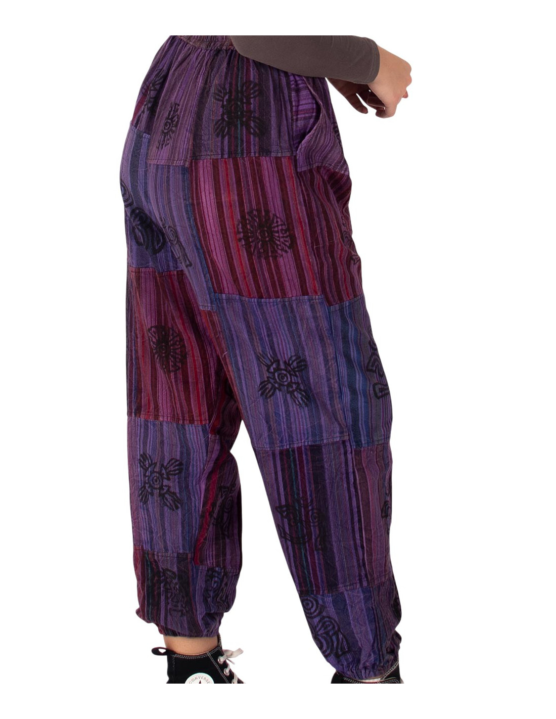 Calças harém unissex em patchwork em tons de algodão roxo.