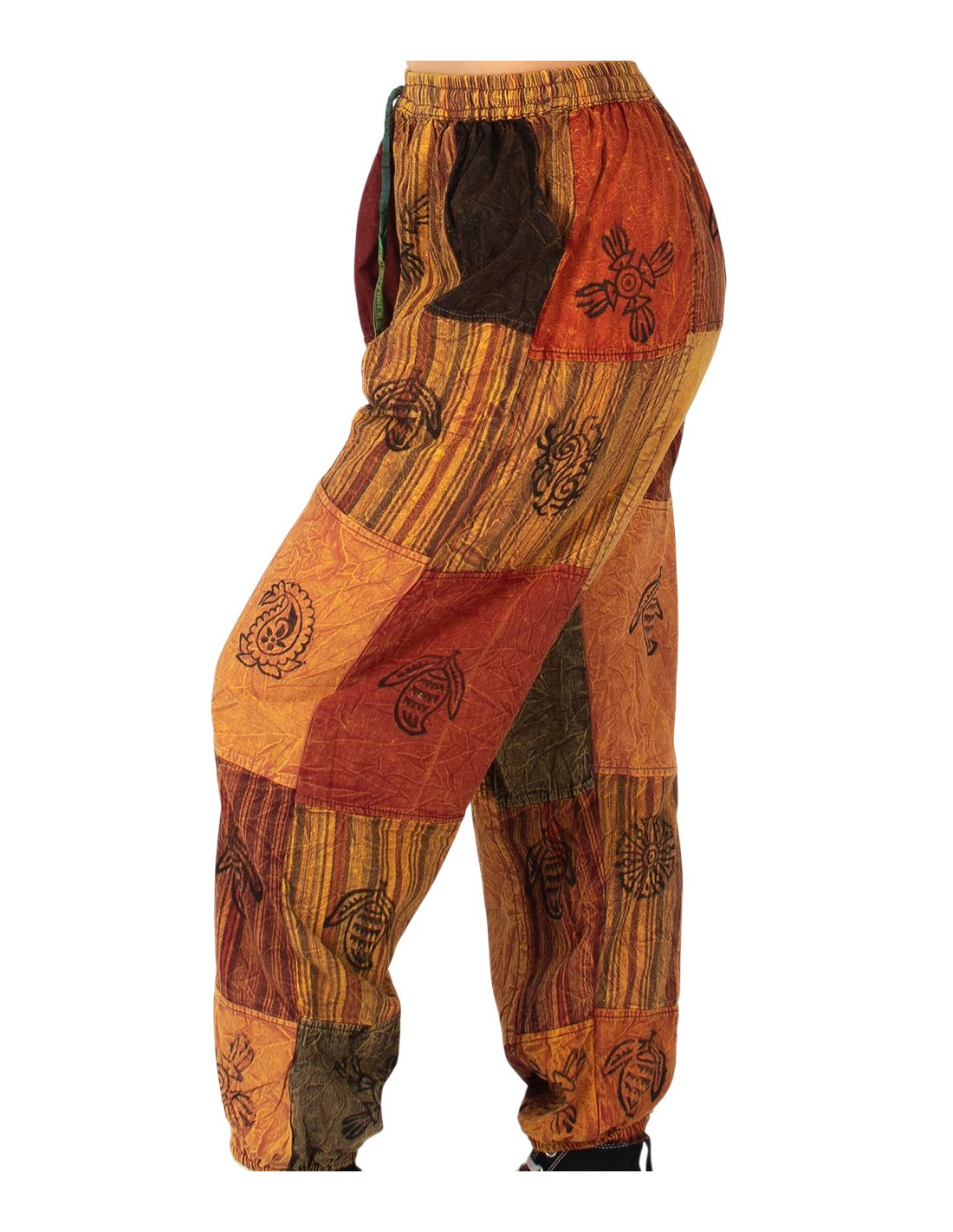 Exiba um estilo autêntico com as calças harém patchwork unissex em tons de amarelo , confeccionadas em algodão de alta qualidade e com acabamento artesanal que lhes confere um caráter único e boêmio.