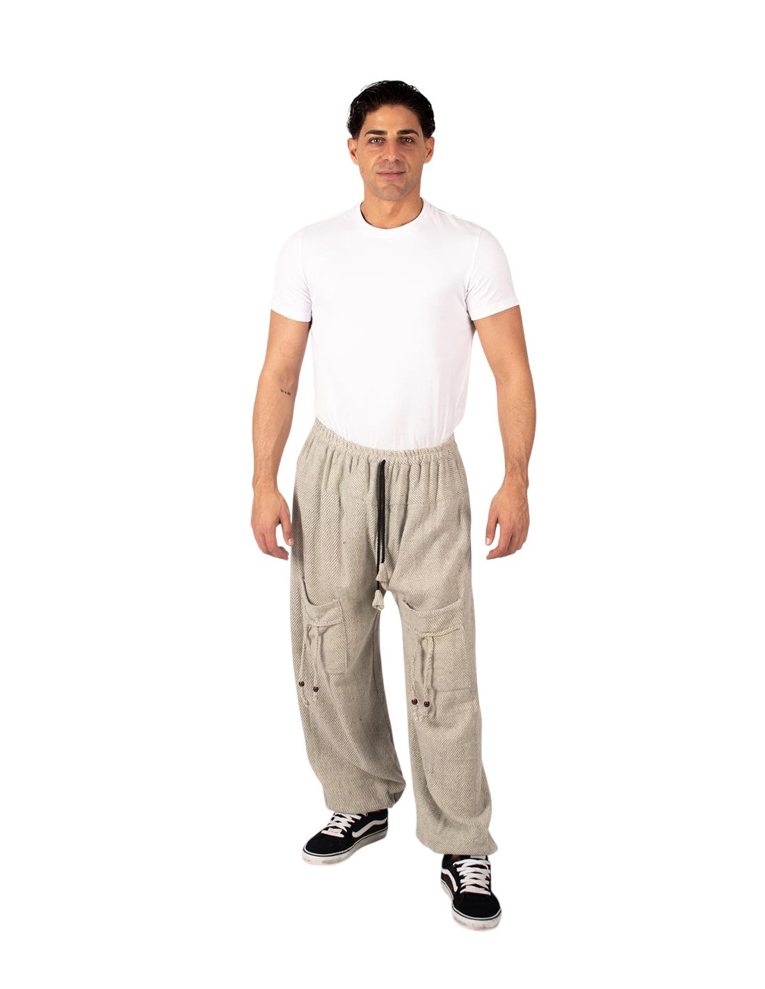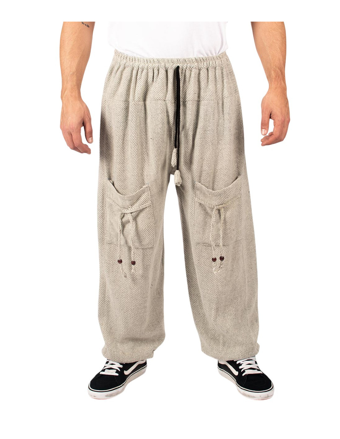 O cós elástico com cordão ajustável permite que a peça se adapte a qualquer tipo de corpo, enquanto o elástico nos tornozelos garante um ajuste confortável e impede a entrada de ar frio. Os dois bolsos na coxa apresentam um detalhe artesanal: tiras com contas de madeira nas extremidades que conferem um toque étnico autêntico.