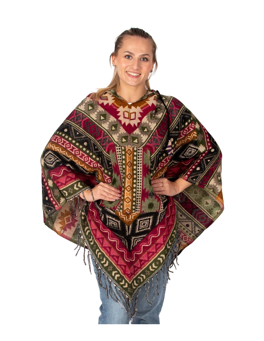 Poncho unissex de inspiração étnica, com capuz ajustável , franjas frontais e bolsos integrados. Possui textura macia e quente, semelhante à lã.