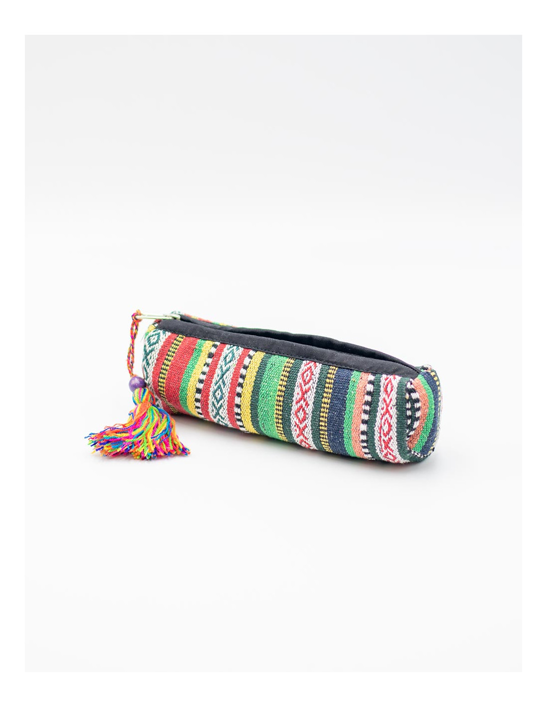 Estojo cilíndrico forrado com fecho de zíper e pompom feito à mão. Estampas vibrantes e exclusivas em tecido de inspiração indiana.