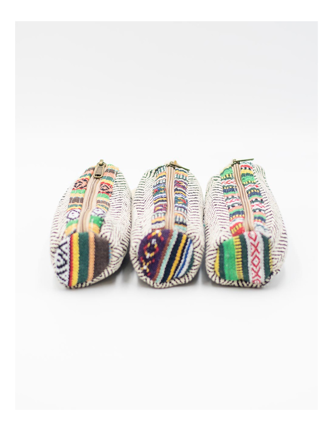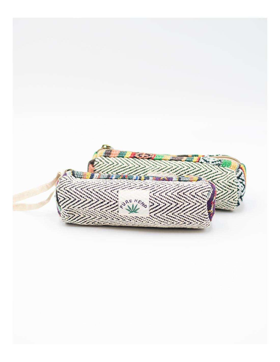 Caixa cilíndrica feita de cânhamo natural, com forro interno e fecho de zíper. Disponível em várias cores com detalhes étnicos artesanais.
