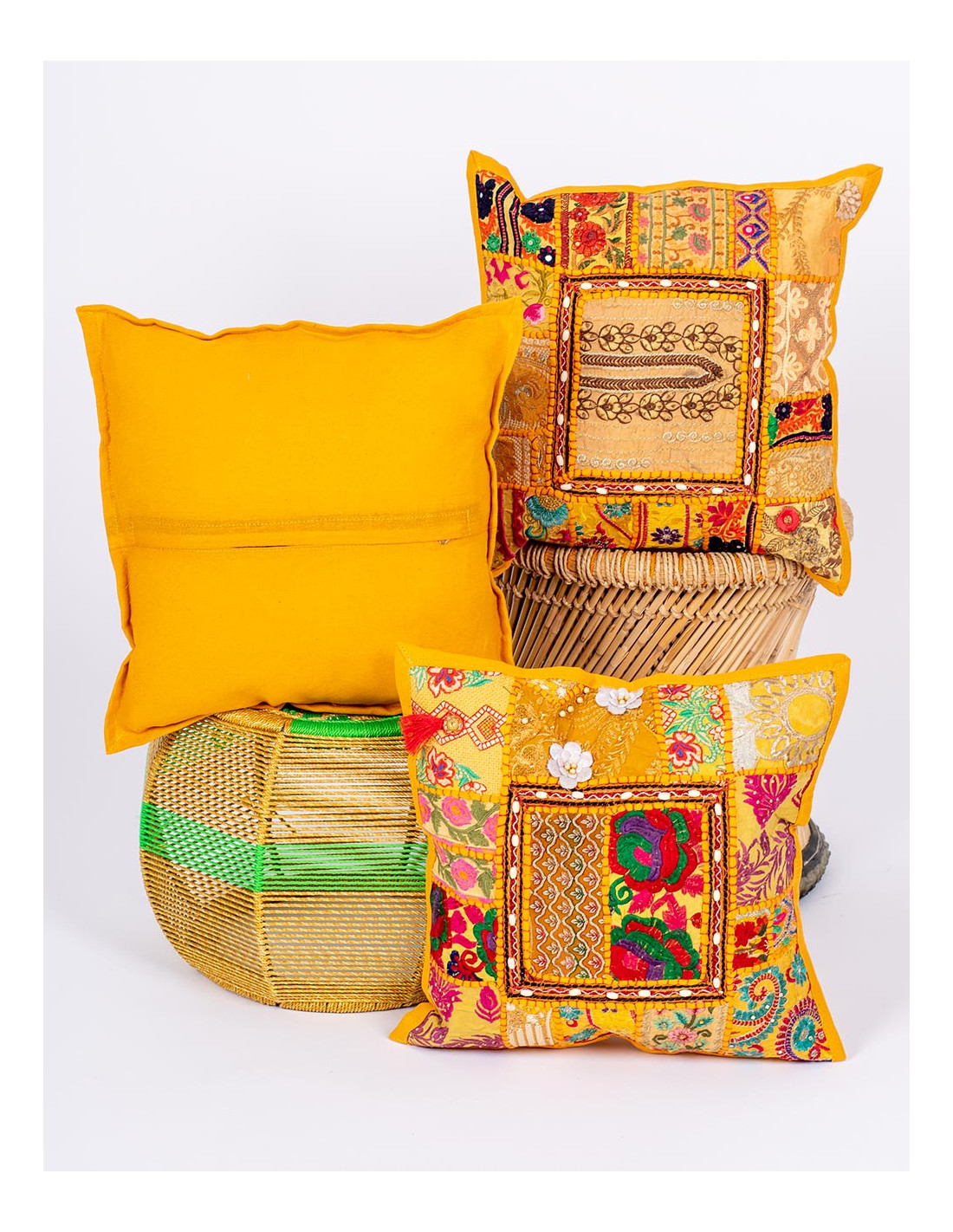 A parte frontal apresenta aplicações bordadas com um pequeno quadrado central decorado com caracóis costurados , enquanto a moldura e o verso mantêm um tom amarelo uniforme , facilitando a combinação com outros tecidos. Cada capa é única nos detalhes do tecido, tornando cada uma exclusiva e autêntica .