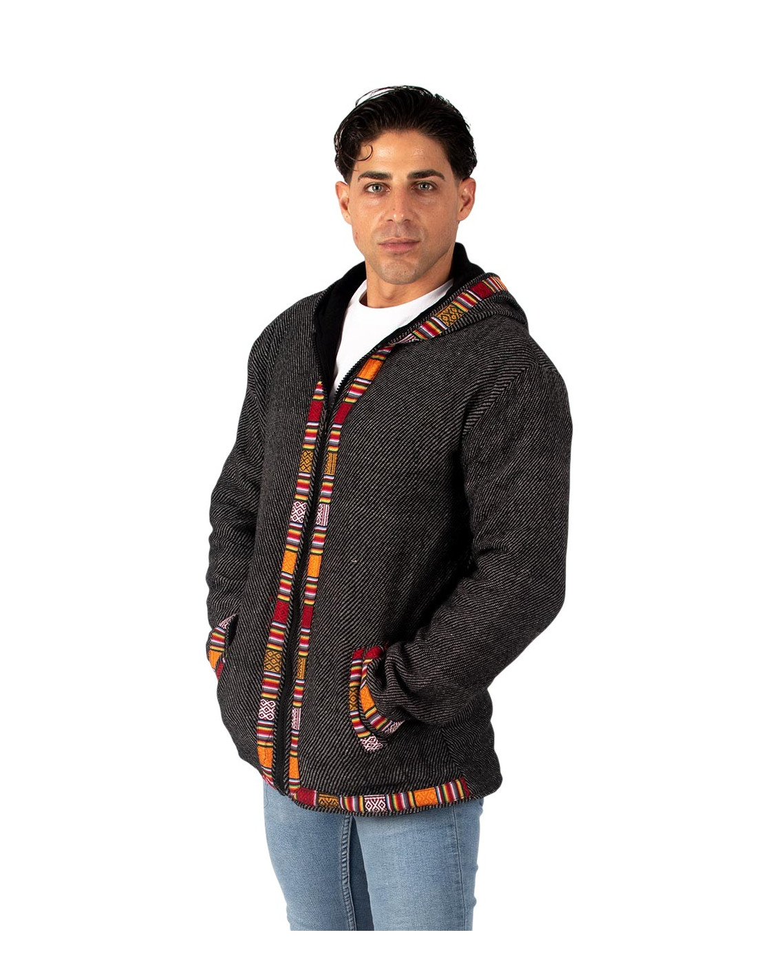 Esta jaqueta cinza-quente é a escolha perfeita para quem busca uma peça aconchegante e prática com um toque de estilo étnico moderno. Ela é feita de fibras sintéticas que imitam a lã , como acrílico e poliéster, resultando em uma textura macia e excelente aquecimento sem sacrificar a leveza ou o conforto.